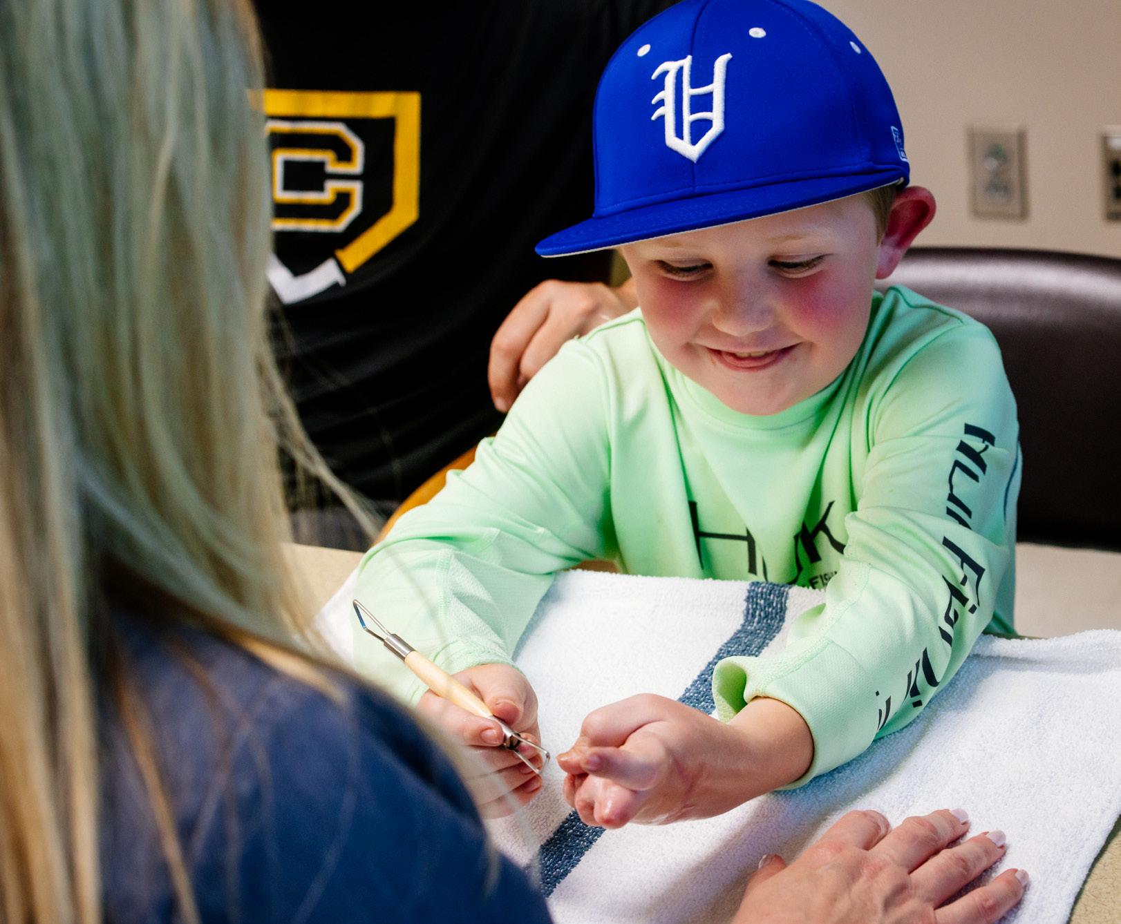 “Waylon is just such a cool patient—he’s our little daredevil. He is so motivated and fiercely independent, and the entire clinic lights up when he walks in,” says Christy Mann, OTR/L, CHT, Waylon’s hand therapist. “He is so focused on using that hand and has not once ever neglected it. His fingers were super sensitive when we began, but we do specific exercises that help with texture exposure so that, when he puts his hand in the baseball glove, he has positive and normal sensations.”