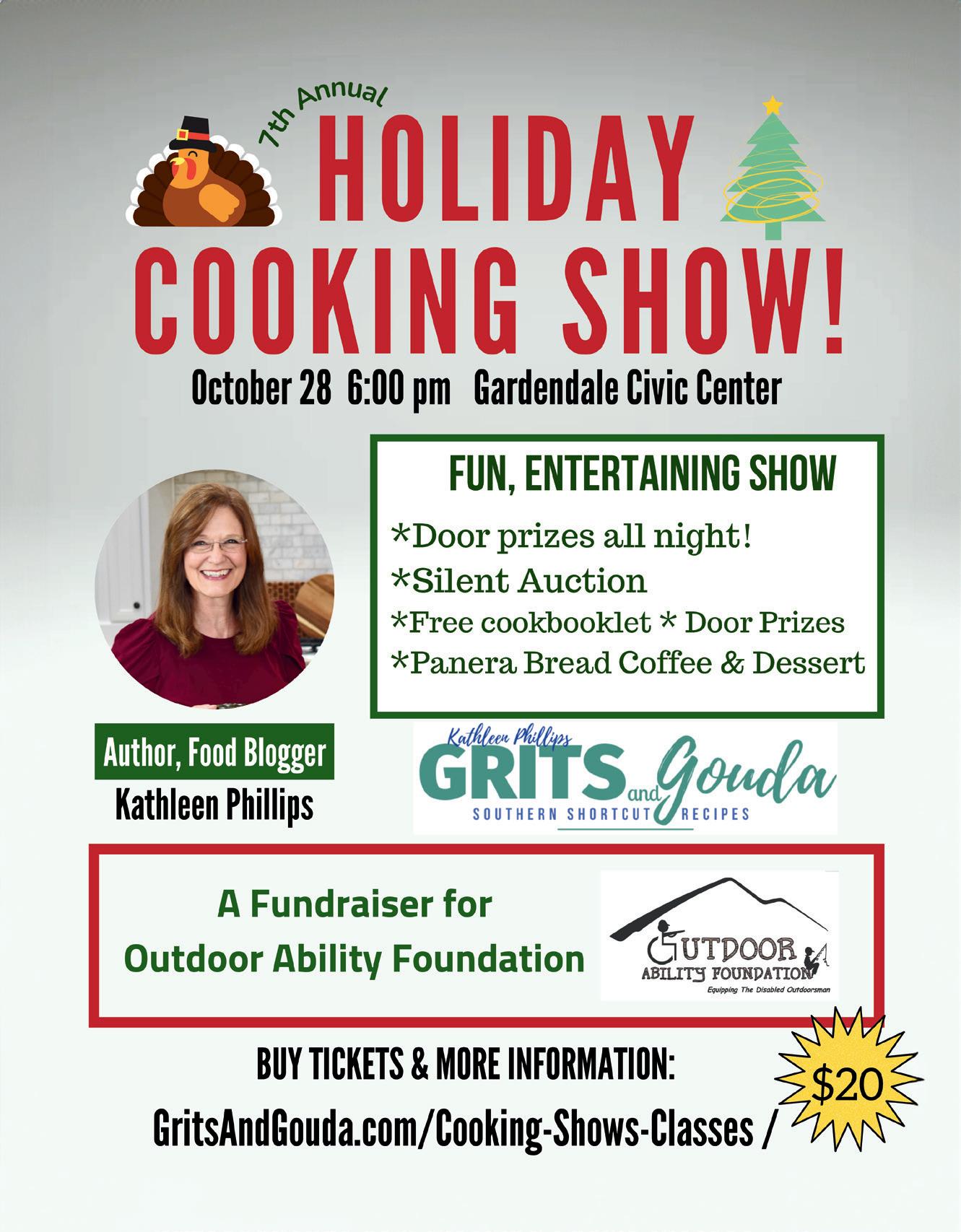 The 7th Annual Holiday Cooking Show will be October 28, at 6 p.m. at the Gardendale Civic Center. The show serves as a fundraiser for the Outdoor Ability Foundation. Tickets will go on sale in early September at GritsandGouda.com.