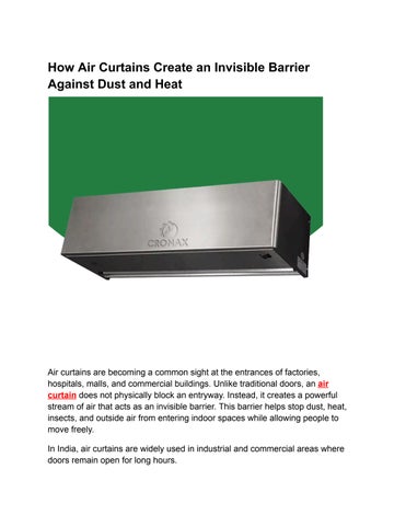 Cronax Industries delivers high-performance air curtains designed to create an invisible barrier against dust, insects, and outside air. Ideal for retail stores, hospitals, factories, and clean environments, our air curtains improve indoor comfort, energy efficiency, and cleanliness.