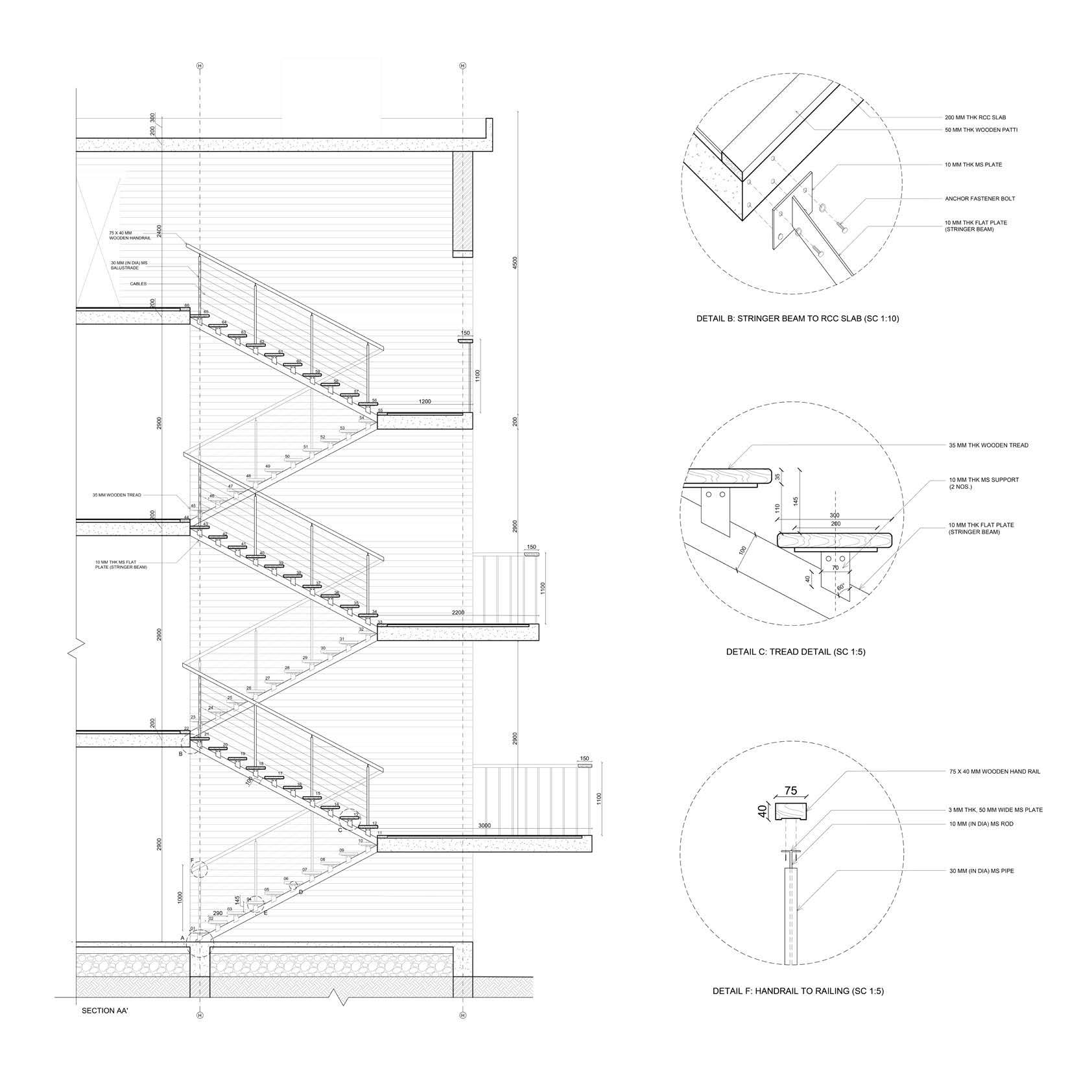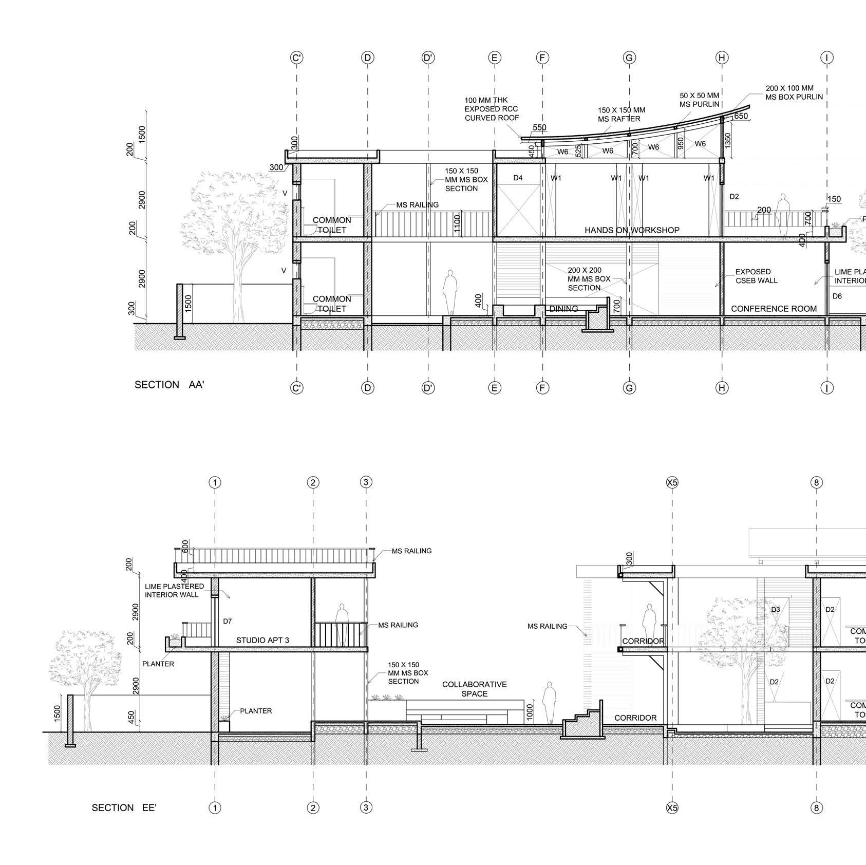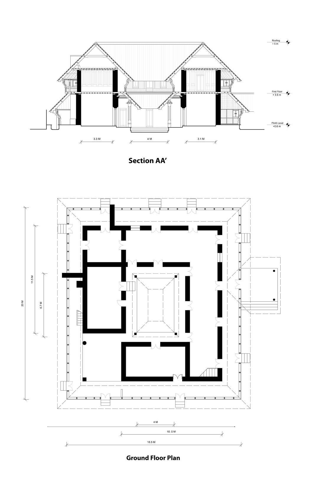 Thai Kottaram is a part of the Padmanabhapuram Palace complex located in Tuckalay, Tamil Nade. It was built originally by Ravi Varma Kulasekhara Perumal in 1601 and later modified in 1750s. Made of stone and teakwood, it follows a Kerala courtyard house typology. Since it is located in a hot and humid place, there are a lot of climatic decisions taken such as the verandah acting as a buffer space and protecting the interior living areas from harsh sun, the central courtyard has the roofing sloped from all directions to drain the rainwater and the horizontal louvres for natural ventilation. These drawings show a clear overview of the building, the overall layout of the spaces around the courtyards, the sloping roofs in the section and the various details of the wooden structural system amalgamating with the stone walls.