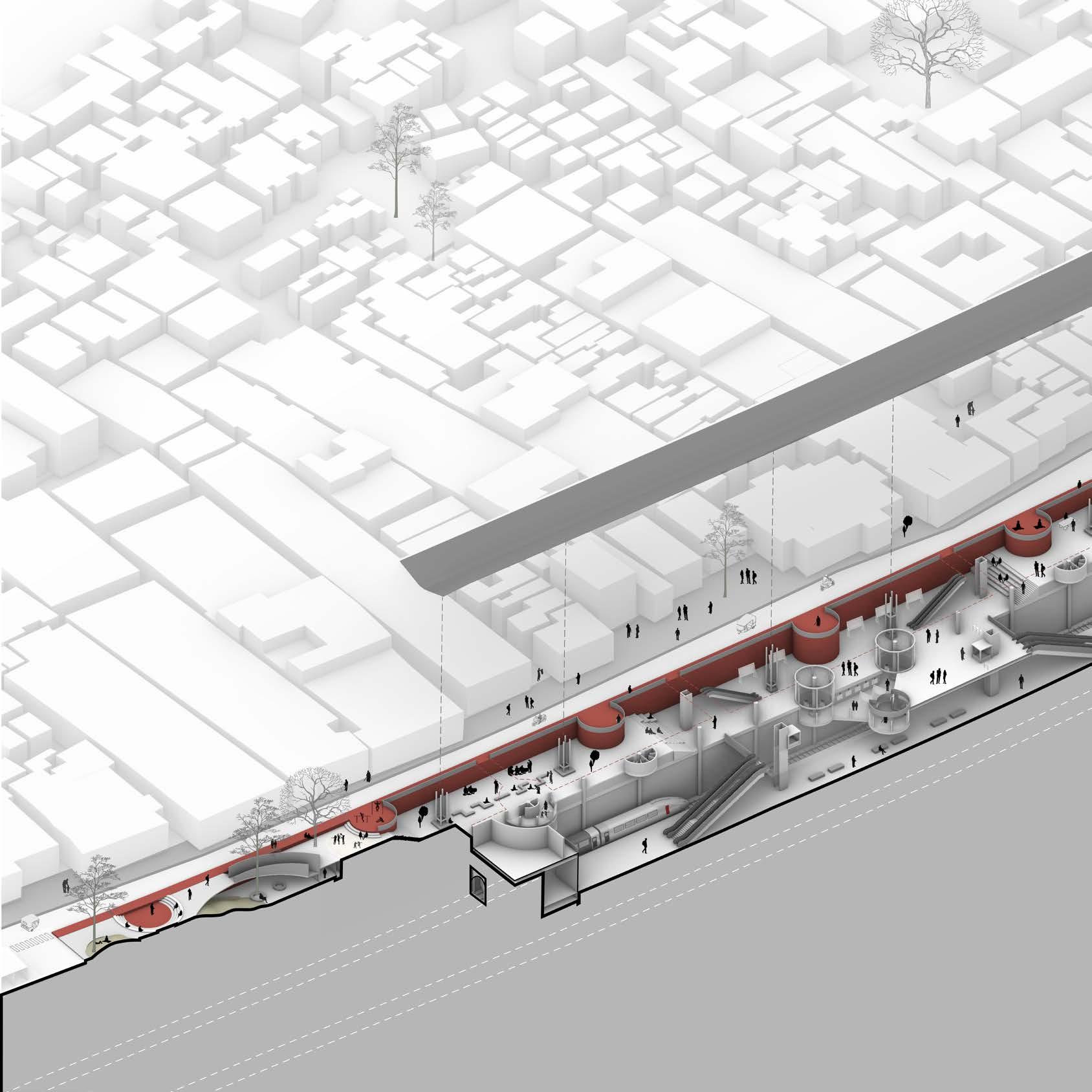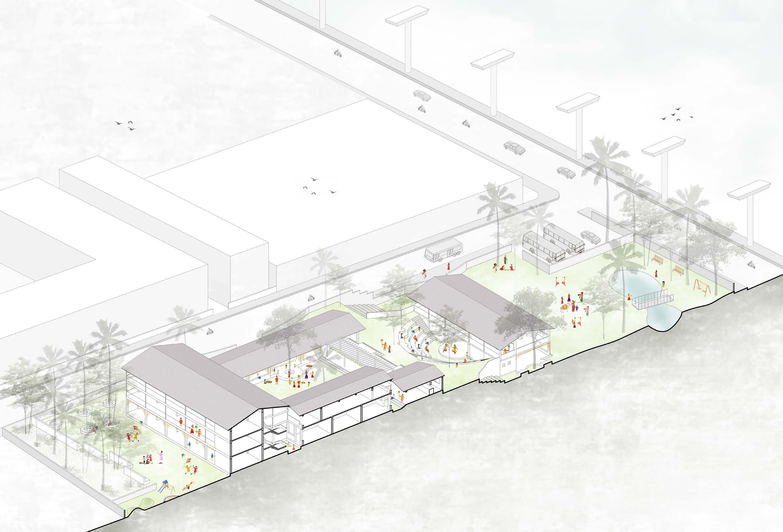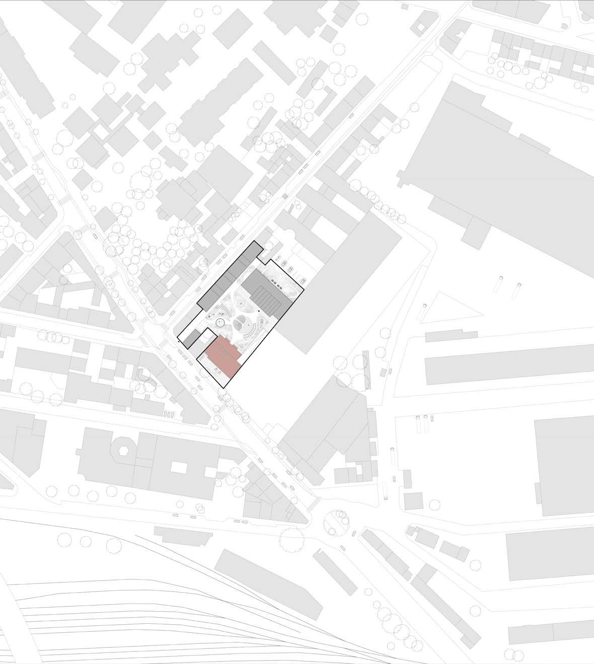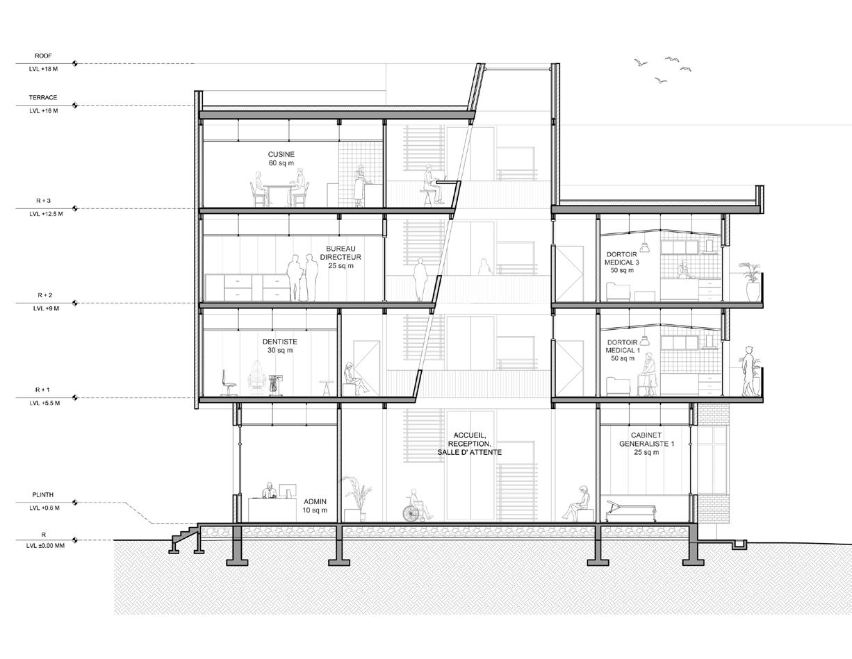 In the heart of Pantin, the project is located along a major road artery of the city of Paris. It aims to create an urban paradise with multiple functions coming together in the same space (the idea of mixed-use typology). The overlapping of distinct functions such as an health centre, leather goods workshop, coworking spaces and multiple housing units can be seen in the project. The central green spaces not only helps in tying the project together but also encourages diverse activities to flourish. After the master plan stage, the studio focused on developing and detailing the individual spaces. The health center is located right in front main road for ease of access. Inorder to increase the visibilty of the building the facade is intentionally made with red bricks. The interior spaces arranged around a central atrium-like space that brings in light and helps in ventilation of the spaces. There are also housing units within the health center which acts as spaces for elderly people, disabled and visiting doctors.