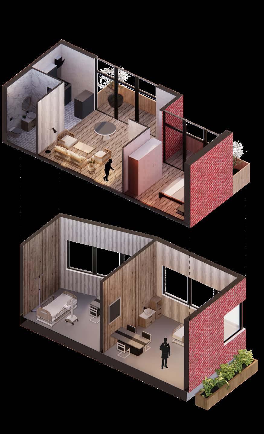 The selected materials, CDX plywood, steel box sections and canvas make the unit durable. The sturdier wooden part of the unit can house services like washrooms, exhausts, etc. The interior spaces are partitioned using canvas cloth that is provided in the box and it can be detached as per the function. Several such units with varying functions come together to form a healthcare institution.