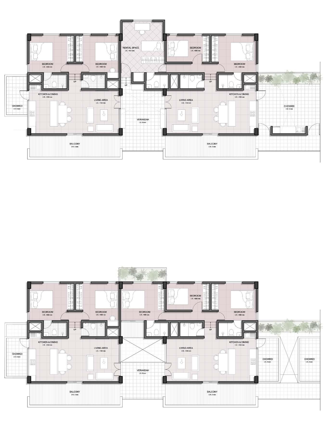 The balconies of the unit are interlinked to form a shared corridor and the lobby spaces become shared verandah and chowkdi.