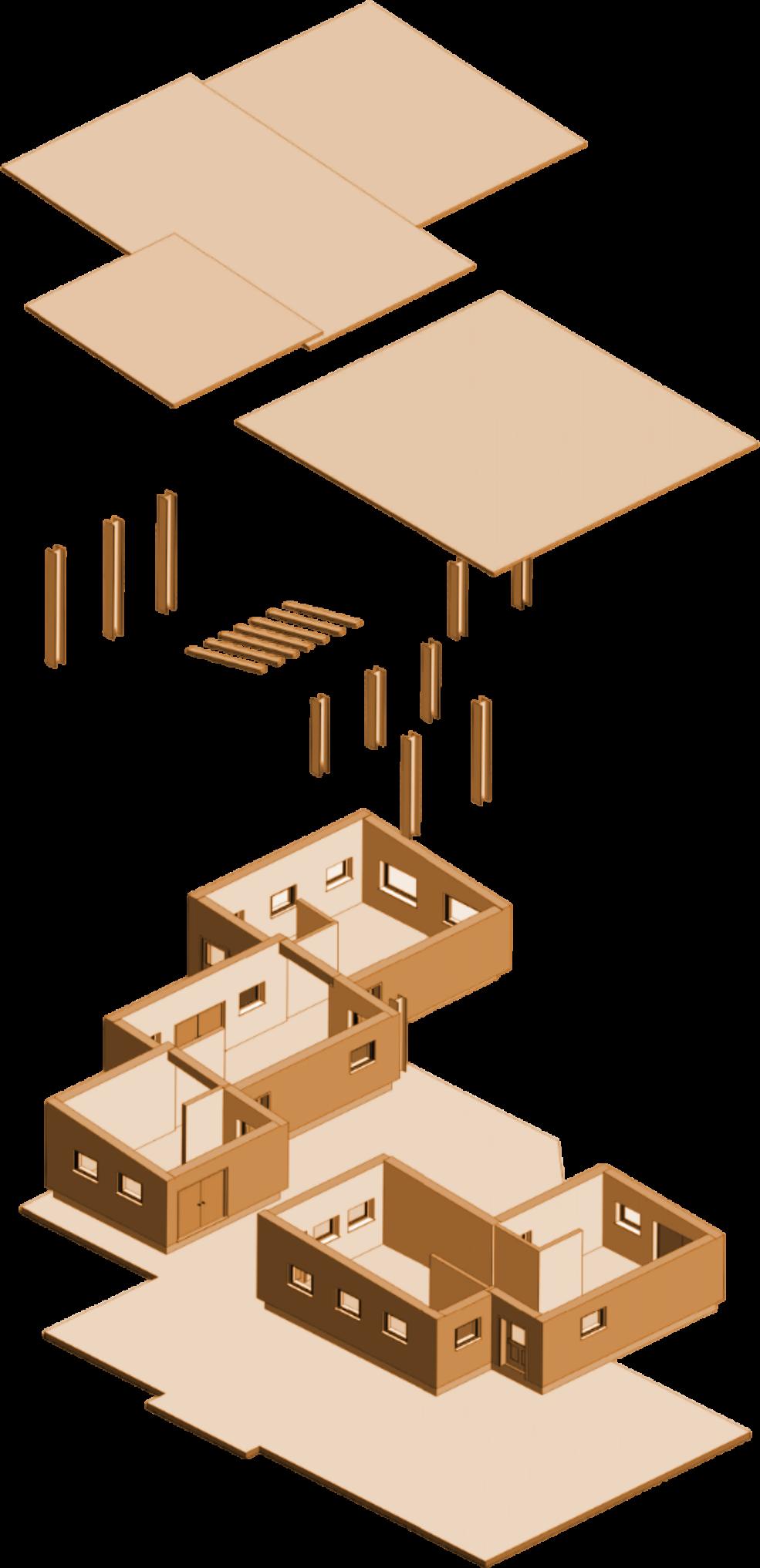 floors, including flat-pack microhome components, which are later test-assembled in the courtyard.