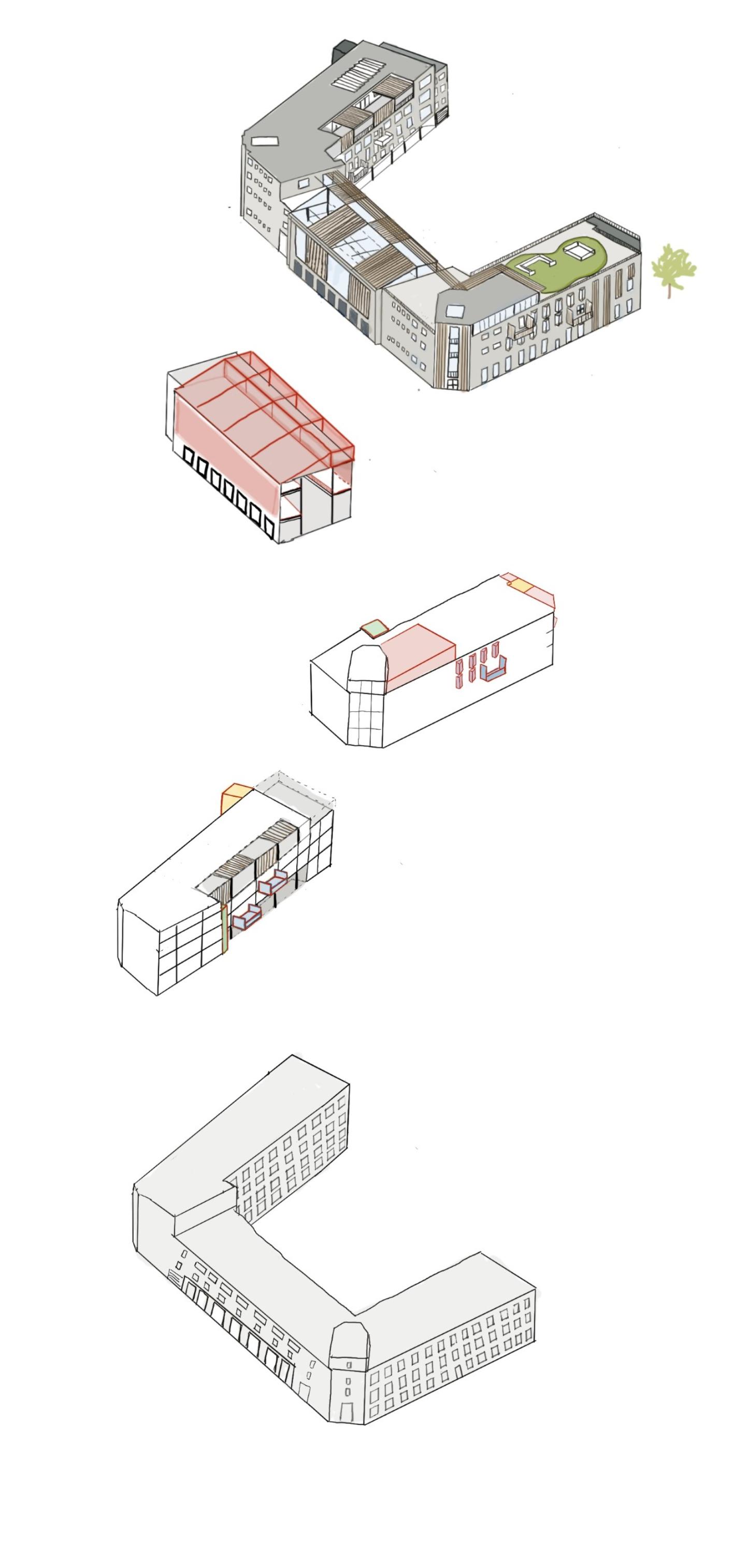 Puzzle based concept where contrasting spaces fit together through difference, with negative and interstitial spaces mediating between activity and restoration and seamlessly divided between