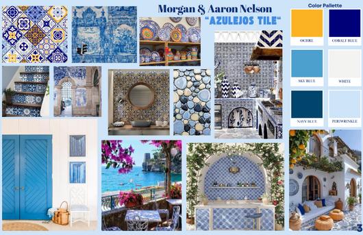 My clients, Morgan and Aaron Nelson, are moving from Georgia to Greensboro Alabama, Lavender Hill. We are designing their dream home based off their passion for traveling. This home transforms spaces into a living canvas, inspired by the beauty and history of Azulejos tiles. It blends Portuguese and Spanish craftsmanship with a modern twist, using ornate geometric patterns and floral motifs to create visual movement throughout. A palette of vibrant hues of whites, cobalt blues, earthy ochres, and gold metals evokes the warmth and charm of Southern Europe. Materials like tile, stone, concrete, wood, and glass merge with modern finishes, balancing historical richness with contemporary design, resulting in a space that feels both captivating and functional.