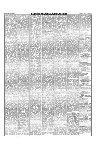 P U B L I C N OT I C E S Sell to be recorded in the County where the real property is located. NOTICE TO POTENTIAL BIDDERS: If you are considering bidding on this property lien, you should understand that there are risks involved in bidding at a trustee auction. You will be bidding on a lien, not on the property itself. Placing the highest bid at a trustee auction does not automatically entitle you to free and clear ownership of the property. You should also be aware that the lien being auctioned off may be a junior lien. If you are the highest bidder at the auction, you are or may be responsible for paying off all liens senior to the lien being auctioned off, before you can receive clear title to the property. You are encouraged to investigate the existence, priority, and size of outstanding liens that may exist on this property by contacting the county recorder’s office or a title insurance company, either of which may charge you a fee for this information. If you consult either of these resources, you should be aware that the same lender may hold more than one mortgage or deed of trust on the property. NOTICE TO PROPERTY OWNER: The sale date shown on this notice of sale may be postponed one or more times by the mortgagee, beneficiary, trustee, or a court, pursuant to Section 2924g of the California Civil Code. The law requires that information about trustee sale postponements be made available to you and to the public, as a courtesy to those not present at the sale. If you wish to learn whether your sale date has been postponed, and if applicable, the rescheduled time and date for the sale of this property, you may call (916)939-0772 or visit this Internet Web http://search.nationwideposting.com/propertySea rchTerms.aspx, using the file number assigned to this case CA1100223969 Information about postponements that are very short in duration or that occur close in time to the scheduled sale may not immediately be reflected in the telephone information or on the Internet Web site. The best way to verify postponement information is to attend the scheduled sale. If the sale is set aside for any reason, the Purchaser at the sale shall be entitled only to a return of the deposit paid. The Purchaser shall have no further recourse. First American Title Insurance Company First American Trustee Servicing Solutions, LLC 3 FIRST AMERICAN WAY SANTA ANA, CA 92707 Date: FOR TRUSTEE'S SALE INFORMATION PLEASE CALL (916)939-0772 First American Trustee Servicing Solutions, LLC MAY BE ACTING AS A DEBT COLLECTOR ATTEMPTING TO COLLECT A DEBT. ANY I N F O R M AT I O N OBTAINED MAY BE USED FOR THAT PURPOSE.NPP0214935 BEVERLY HILLS COURIER 03/29/2013, 04/05/2013, 04/12/2013 –––––– NOTICE OF TRUSTEE'S SALE APN: 5555-029-