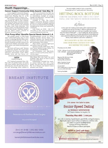 Health Happenings... Cancer Support Community Gilda Awards’ Gala May 14 Cancer Support Community Benjamin Center (CSC) presents its annual Gilda Award Gala, Thursday, May 14, at the InterContinental Hotel in Century City. The evening, chaired by Pat Kennedy and emceed by NBC4’s Fritz Coleman, will honor Tig Notaro, Grammy-nominated comedian and breast-cancer survivor with the “Gilda Award” to be presented by fellow comic Sarah Silverman; YAS Fitness Centers’ Founder Kimberly Fowler and VP Sherri Rosen (“Wellness Award”); and Dr. Mitch Golant (“Harold H. Benjamin Innovation Award”).