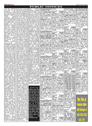 Nicole Rodriguez, Foreclosure Associate This communication is an attempt to collect a debt and any information obtained will be used for that purpose. However, if you have received a discharge of the debt referenced herein in a bankruptcy proceeding, this is not an attempt to impose personal liability upon you for payment of that debt. In the event you have received a bankruptcy discharge, any action to enforce the debt will be taken against the property only. LEGAL DESCRIPTION A CONDOMINIUM COMPOSED OF:PARCEL 1:AN UNDIVIDED 1,134/27,450 INTEREST IN AND TO ALL THAT PORTION OF LOT 1, TRACT 37858, IN THE CITY OF WEST HOLLYWOOD, COUNTY OF LOS ANGELES, STATE OF CALIFORNIA, AS PER MAP RECORDED IN BOOK 993, PAGES 13 AND 14 OF MAPS, IN THE OFFICE OF THE COUNTY RECORDER OF SAID COUNTY, SHOWN AND DEFINED AS "COMMON AREA" ON THE CONDOMINIUM PLAN RECORDED OCTOBER 28, 1981 AS INSTRUMENT NO. 81-1062242 OF OFFICIAL RECORDS OF SAID COUNTY.PARCEL 2:ALL THAT PORTION OF LOT 1, TRACT 37658 AS SHOWN AND DEFINED AS UNIT NO. 11 ON SAID CONDOMINIUM PLAN.PARCEL 3:NON-EXCLUSIVE EASEMENTS FOR THE BENEFIT OF AND APPURTENANT TO PARCELS 1 AND 2 ABOVE, AS SUCH EASEMENTS ARE SET FORTH IN THE SECTIONS ENTITLED "CERTAIN EASEMENTS FOR OWNERS" AND "SUPPORT, SETTLEMENT AND ENCROACHMENT" OF THE ARTICLE OF THE "DECLARATION" ENTITLED "EASEMENTS". NPP0289150 To: BEVERLY HILLS COURIER 08/19/2016, 08/26/2016, 09/02/2016