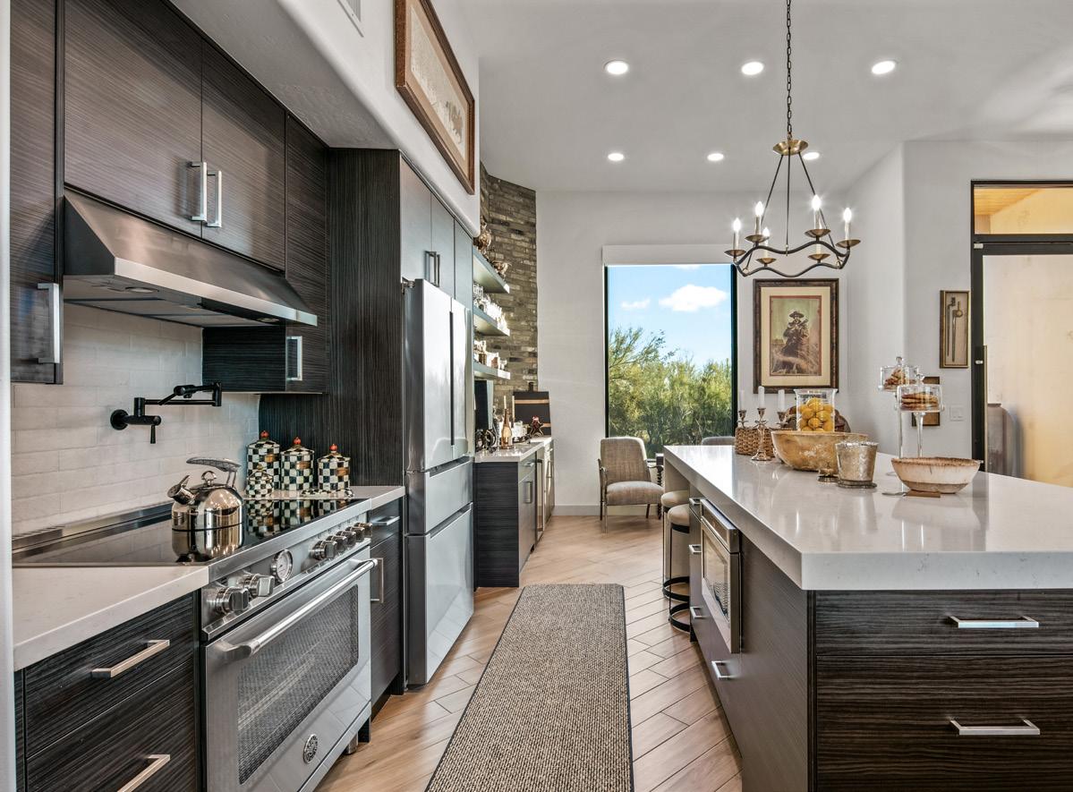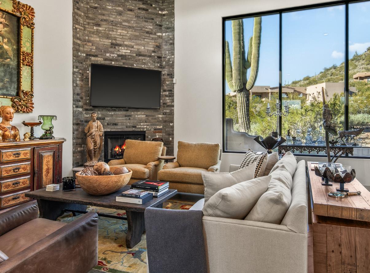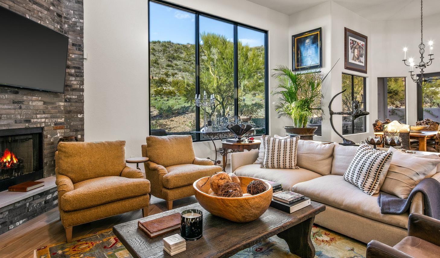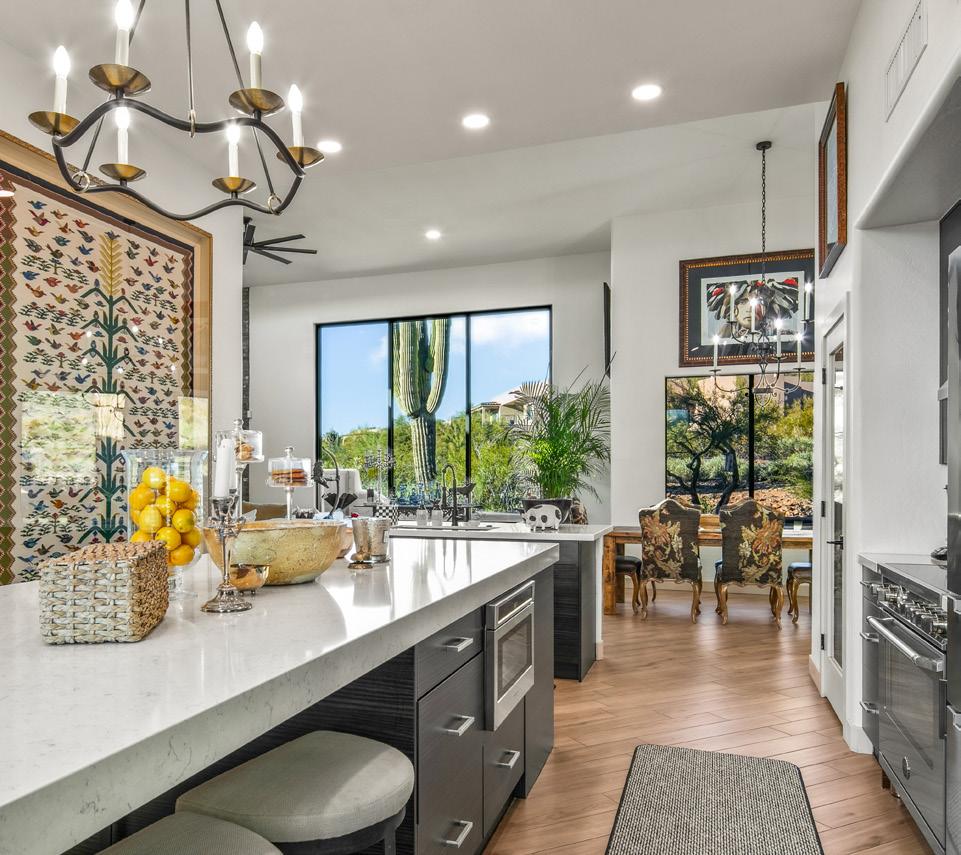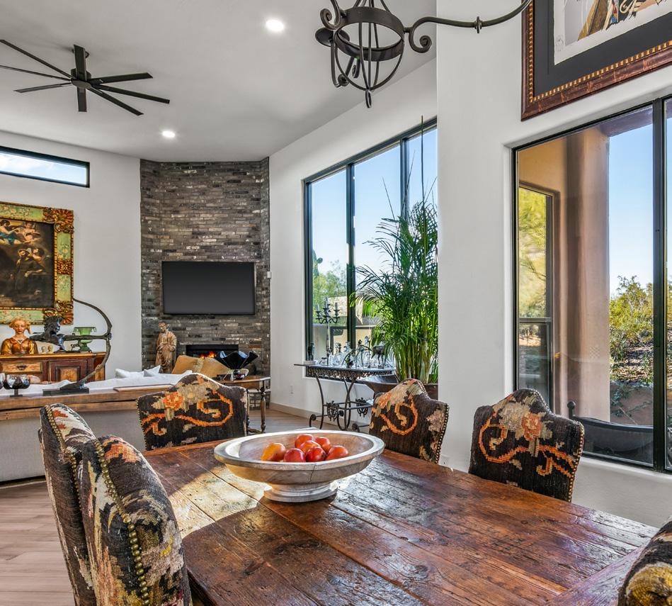 Expansive picture windows capture stunning desert and mountain views, filling the home with light. The openconcept floor plan is designed for effortless entertaining, featuring a chef’s kitchen with impressive double islands, a dry bar, and a seamless flow into the dining area and great room. An attractive brick-surround fireplace adds warmth and character to the space.