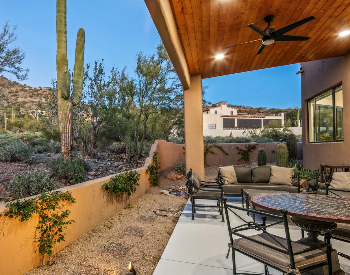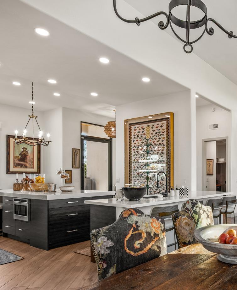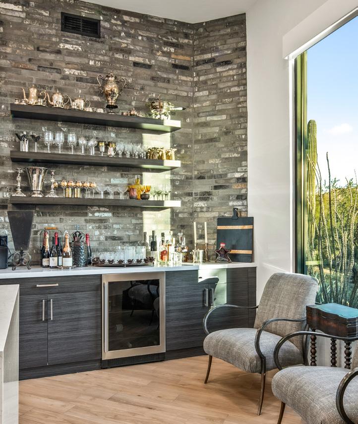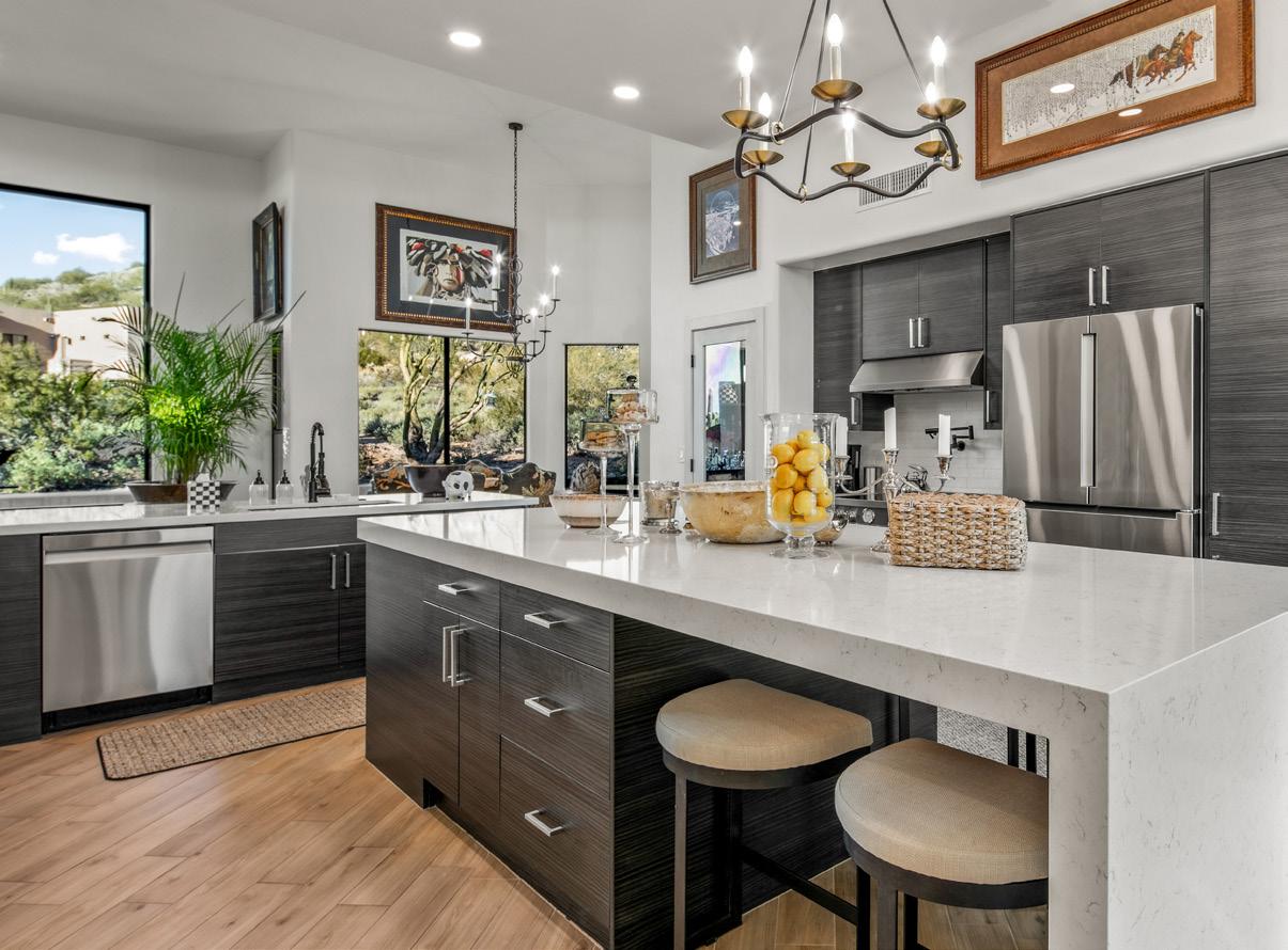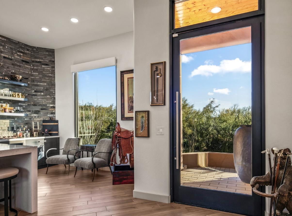 Expansive picture windows capture stunning desert and mountain views, filling the home with light. The openconcept floor plan is designed for effortless entertaining, featuring a chef’s kitchen with impressive double islands, a dry bar, and a seamless flow into the dining area and great room. An attractive brick-surround fireplace adds warmth and character to the space.