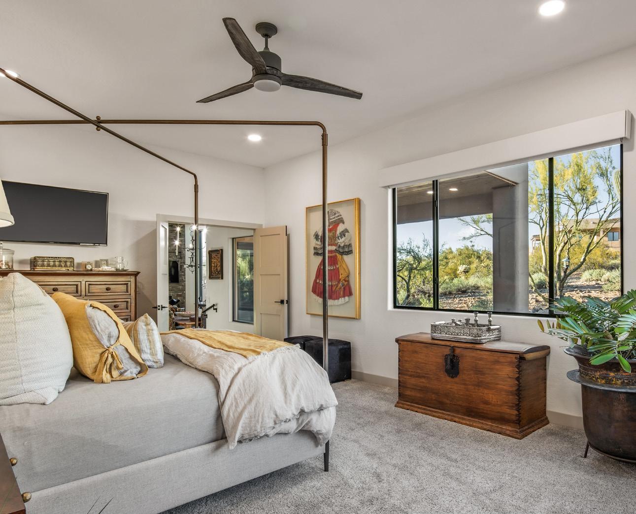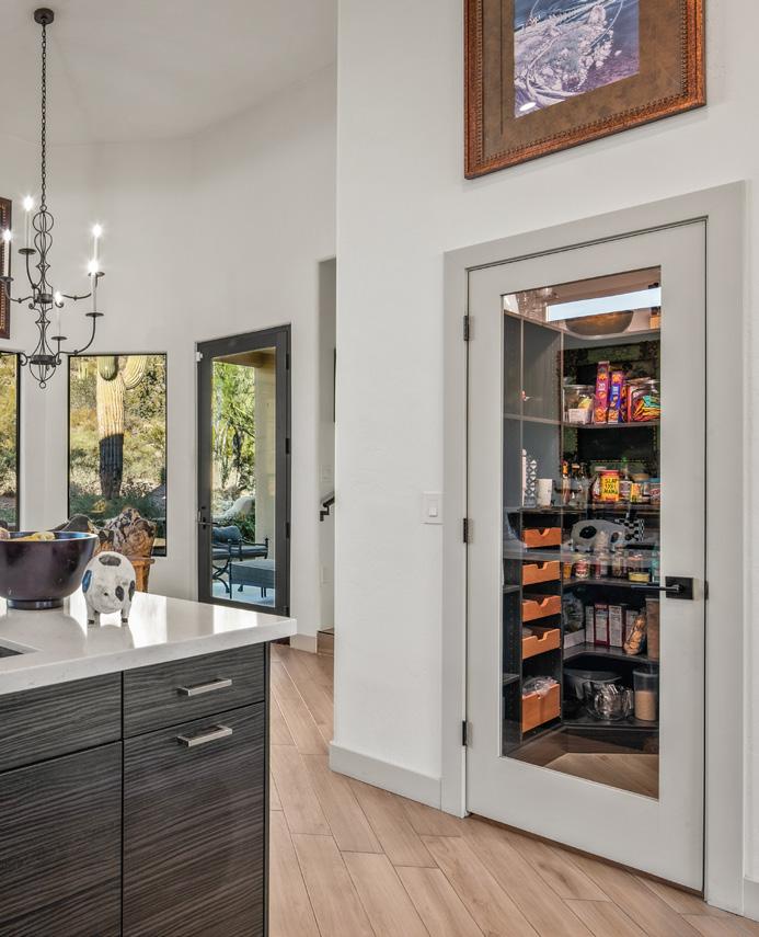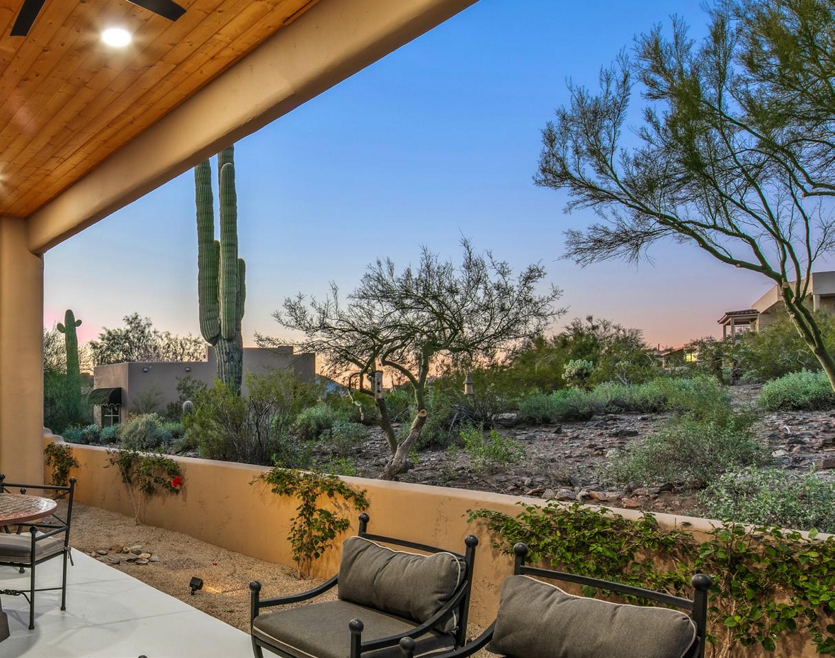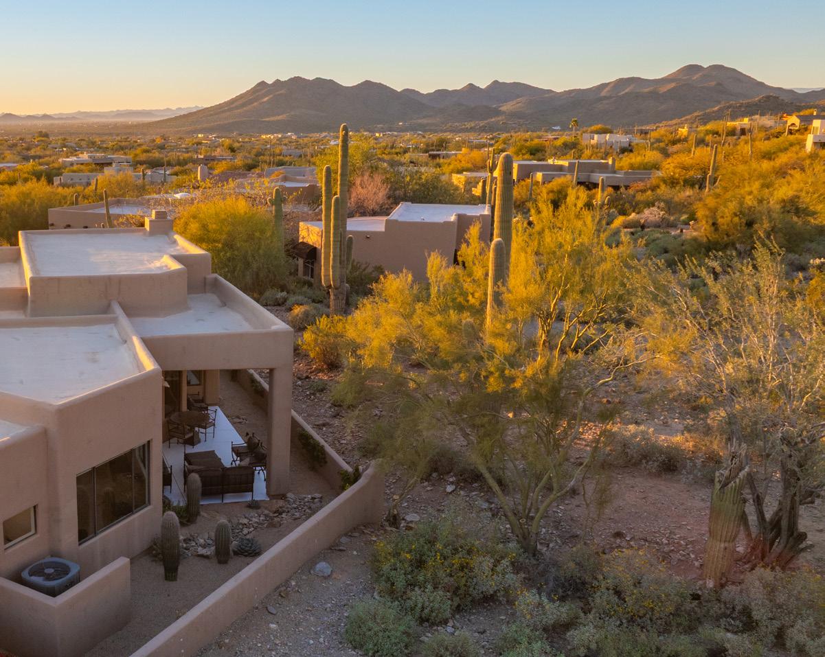 Expansive picture windows capture stunning desert and mountain views, filling the home with light. The openconcept floor plan is designed for effortless entertaining, featuring a chef’s kitchen with impressive double islands, a dry bar, and a seamless flow into the dining area and great room. An attractive brick-surround fireplace adds warmth and character to the space.