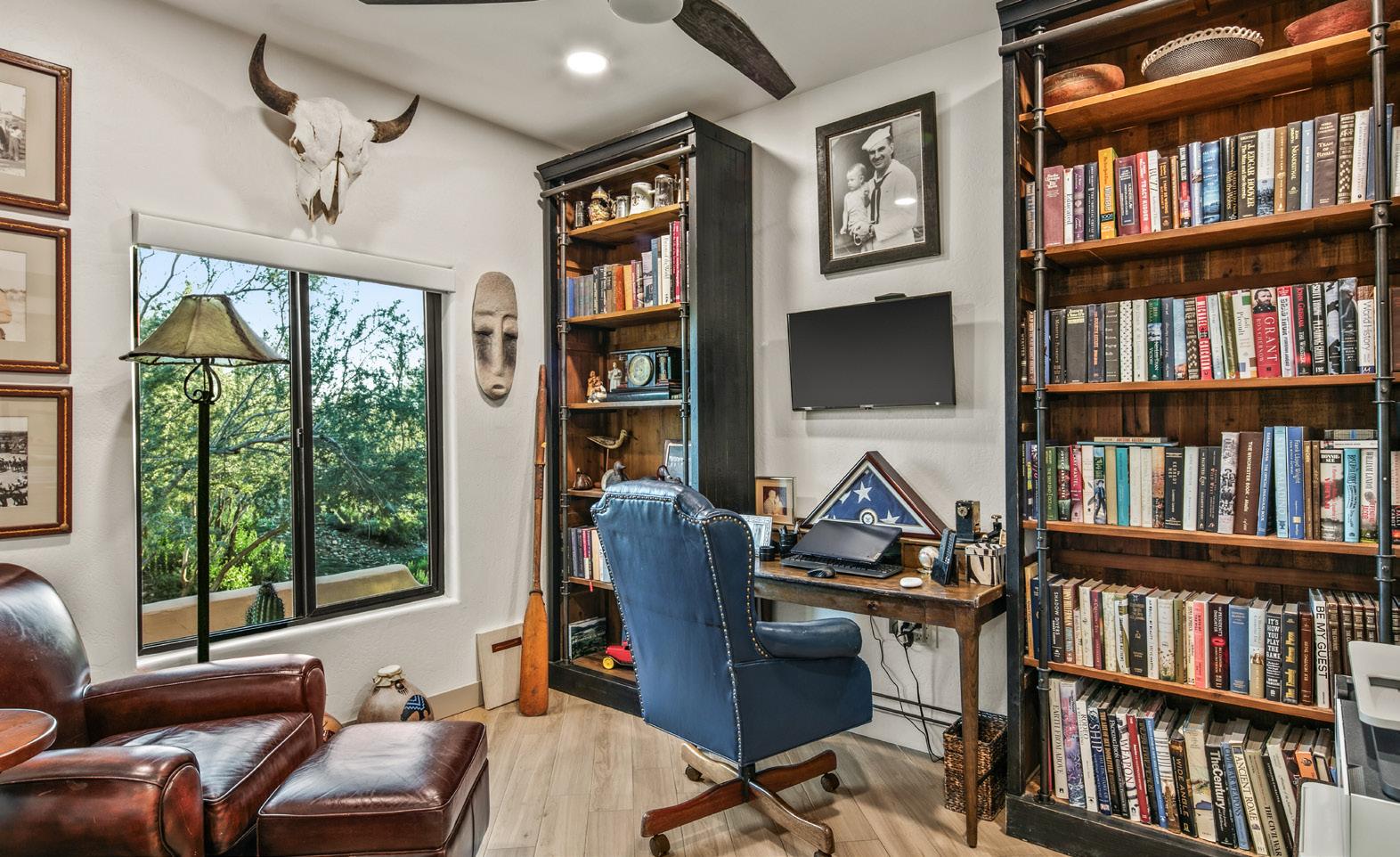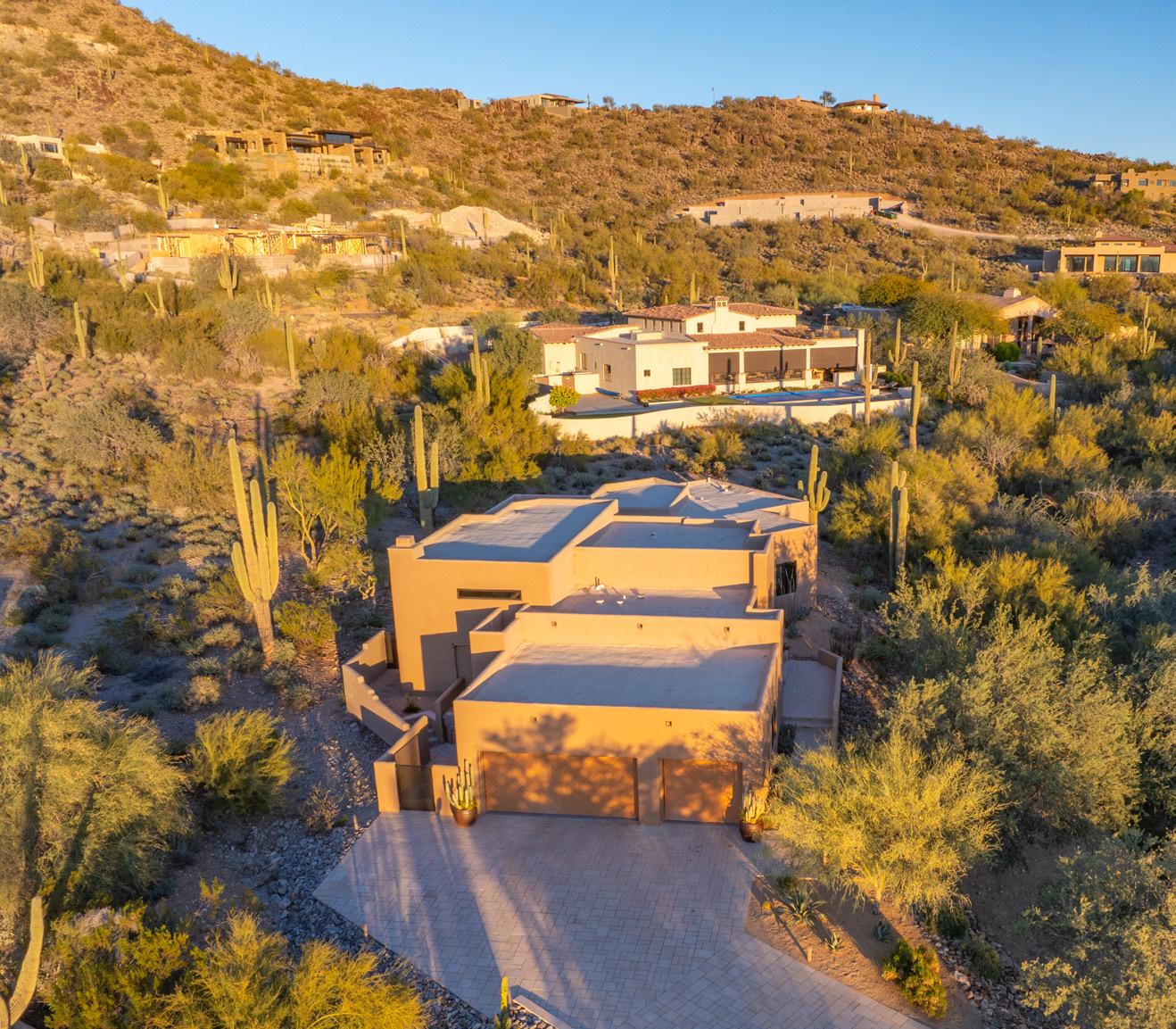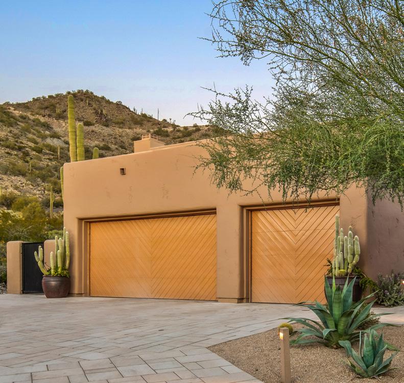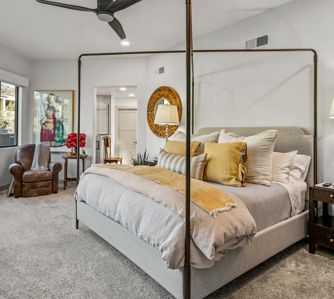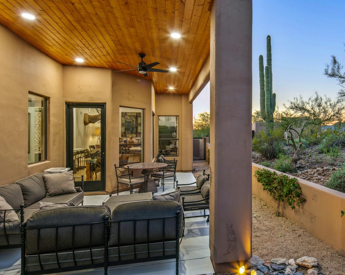 Expansive picture windows capture stunning desert and mountain views, filling the home with light. The openconcept floor plan is designed for effortless entertaining, featuring a chef’s kitchen with impressive double islands, a dry bar, and a seamless flow into the dining area and great room. An attractive brick-surround fireplace adds warmth and character to the space.
