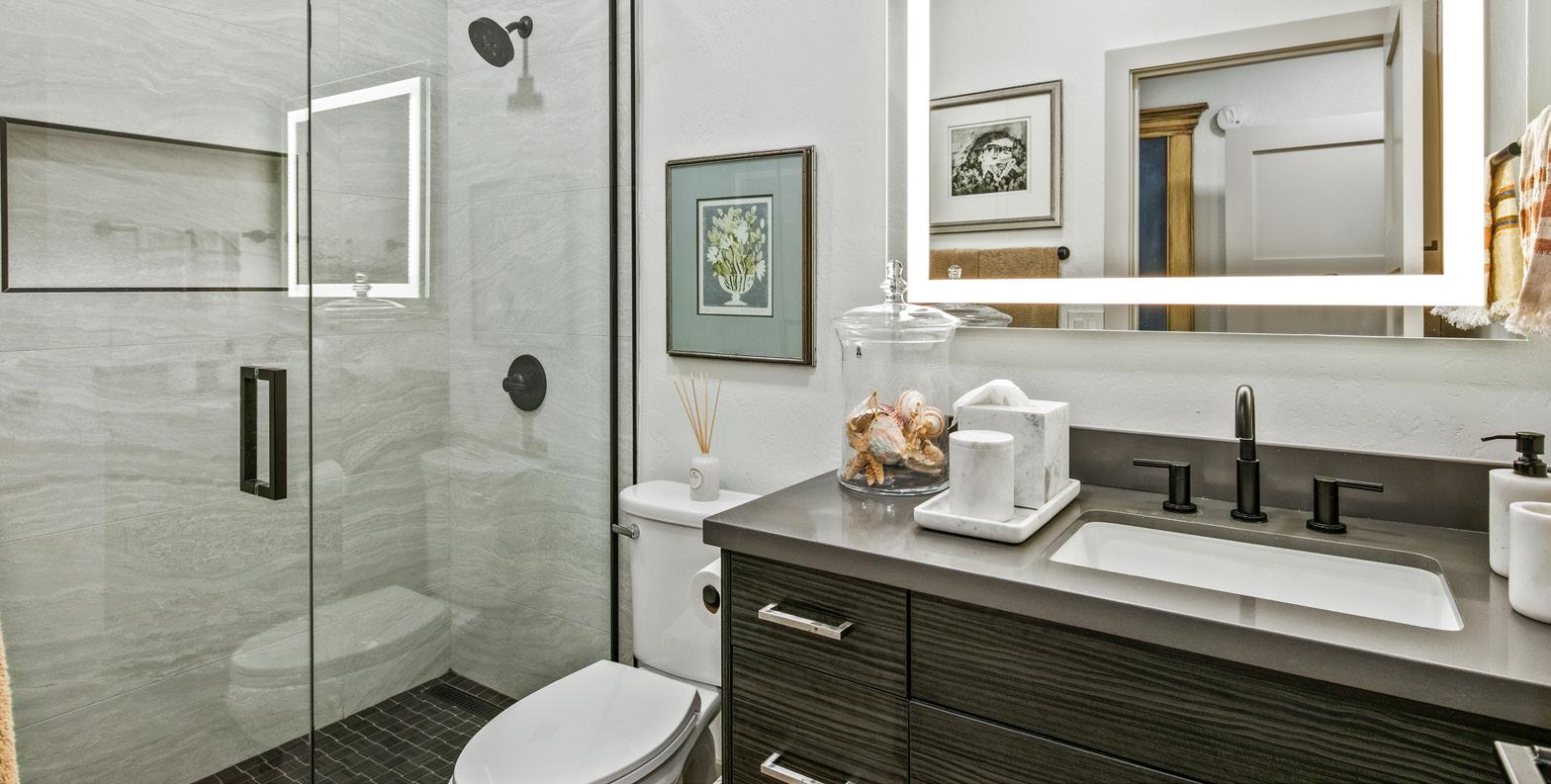 • Vanity with undermount sink and quartz countertops