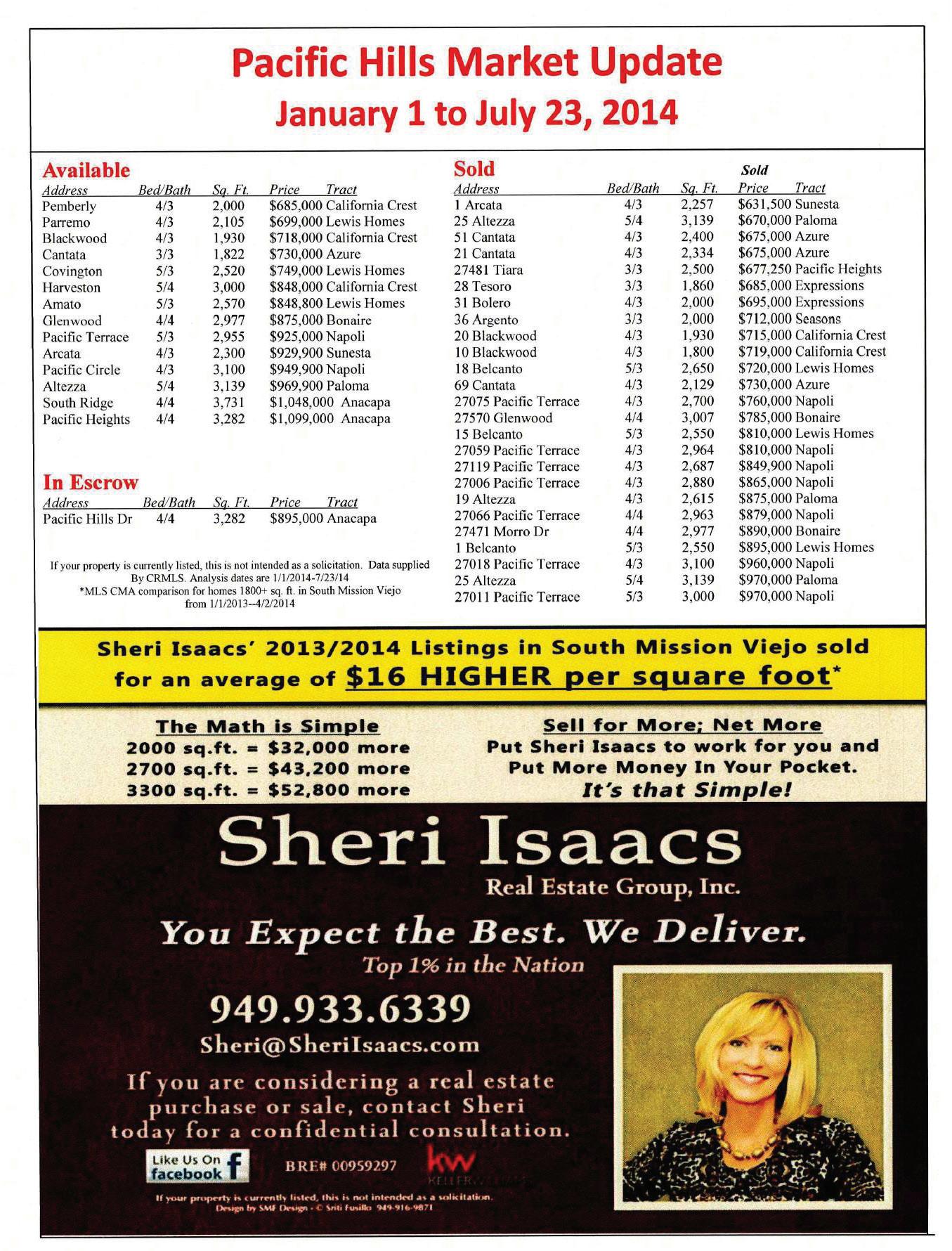 Sheri Isaacs has been working with Buyers and Sellers in Mission Viejo and surrounding cities since 2001 and ranks as the top agent in Mission Viejo over the last 15 years. Sheri Isaacs Real Estate Group, Inc. offers a team of full-time professionals, each with their own specialty, dedicated to working together to serve clients with the highest degree of professionalism and integrity. Orange County home sellers and buyers can rest assured their interests will be protected, and they will have the expert guidance they need to make wise real estate decisions, working with Sheri and her team.