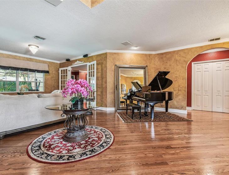 Escape to this impeccable Mediterranean-style gated estate, a secluded sanctuary designed for those seeking tranquility and privacy. Custom-built with the finest materials, this estate sits gracefully on 5.3 manicured acres, offering easy access to I-75 for convenient commutes to Tampa or Ocala. The exterior boasts a sprawling 3,600 sq. ft. screened lanai with a heated pool/spa, outdoor kitchen, water fountain, fire pits, putting green, and 10,000 sq. ft. of flagstone pavers. Car enthusiasts will love the sevencar garage, including three air-conditioned bays. Indoors, the home features 4 spacious bedrooms—3 of which are en-suites—a chef’s kitchen with a butler’s pantry, formal and casual living areas, a sauna, media room, office, and bonus room. Modern luxury is evident with a Crestron Digital home system, high-end commercial appliances, and imported marble, travertine, and wood floors. Professionally decorated with exquisite furnishings, artistic paint, and unique lighting, this estate is offered fully furnished, including artwork, for those desiring a turnkey luxury living experience.