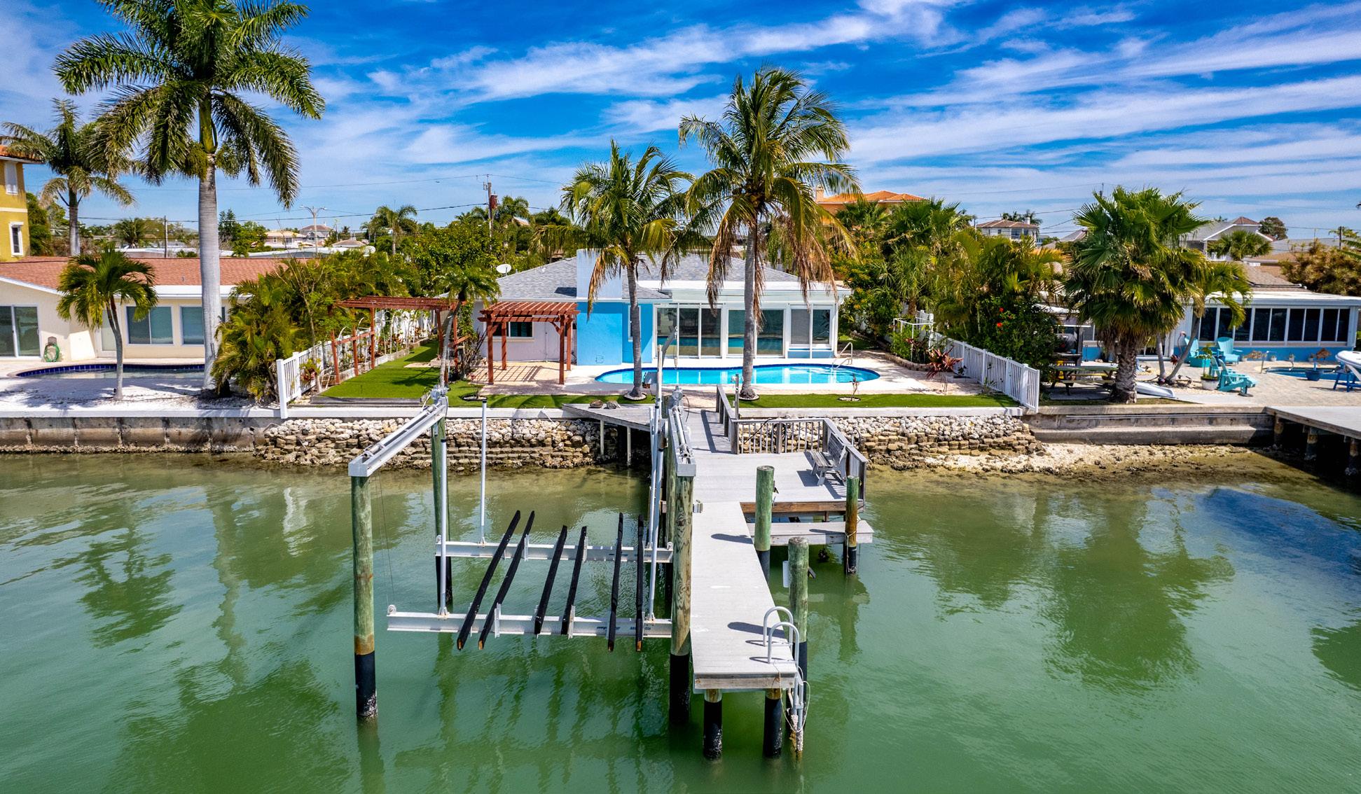 Discover waterfront luxury in Indian Rocks Beach with this exquisite 3-bedroom, 2.5-bath home, showcasing deep canal views and a split floor plan with vaulted ceilings. Pride of ownership is evident through custom features, including a cozy wood-burning fireplace and expansive pocket sliders in the open great room, offering serene water and pool vistas. The outdoor haven features a covered patio, pavered pool with sun shelf, and a heated spa. The master suite is a retreat with an en-suite bath, featuring a glass stall shower and Jacuzzi tub, plus a walk-in closet with custom shelving. Sustainability meets luxury with a metal roof and solar panels. A 10,000 lb boat lift provides easy Gulf access. Enjoy vibrant community amenities and stunning sunsets just blocks away. Embrace the dream of sophisticated waterfront living in a soughtafter beachside community.