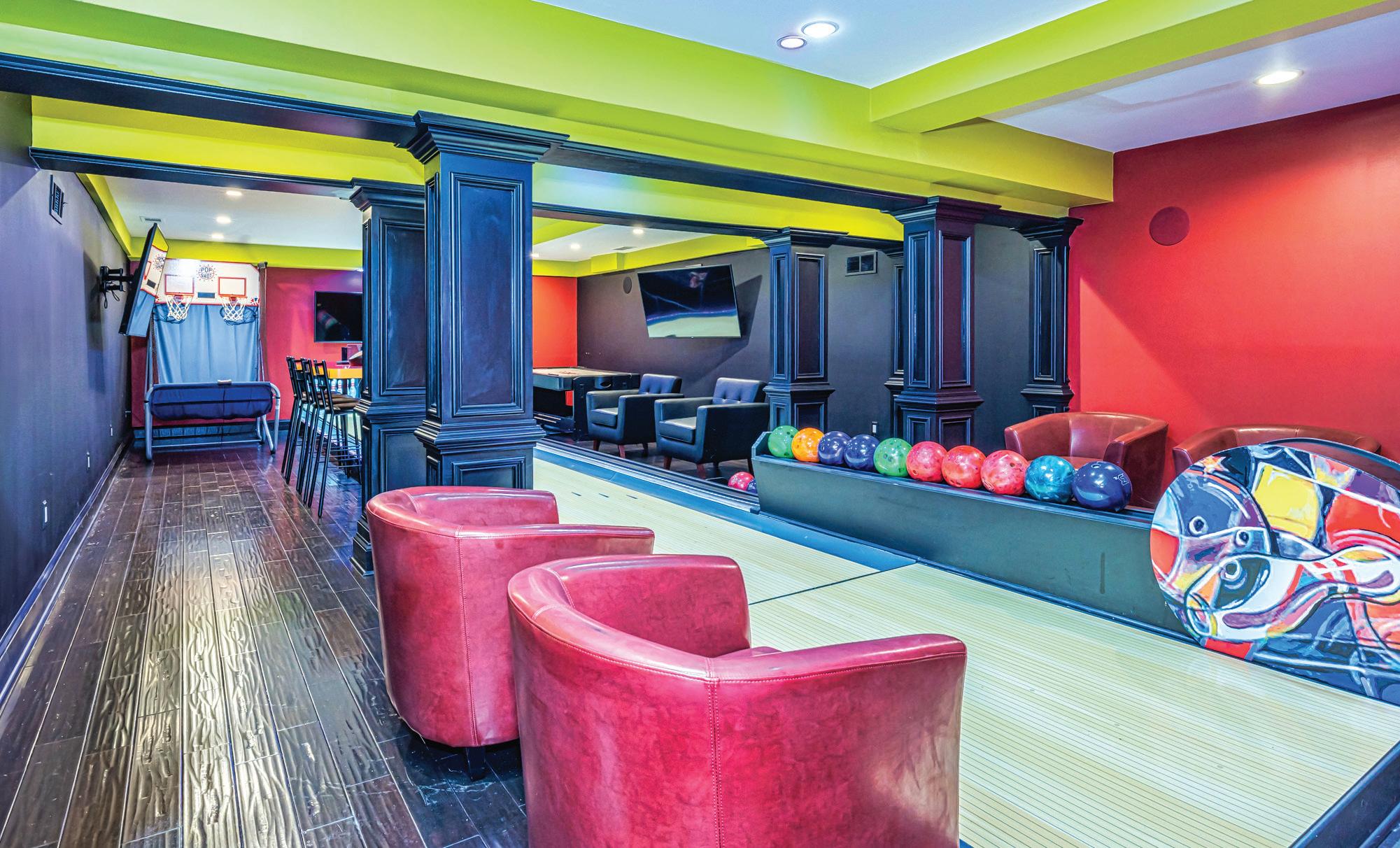 Upstairs, three bedroom suites each offer built-in cabinetry, window seating, and generous closet space, along with elevator access, sitting areas, and ample storage. The lower level provides exceptional entertainment options, featuring a tavern-style bar, home theater, game room with vintage arcade games, full bath, and a regulation 10-pin bowling alley. Outside, a sport court for tennis, pickleball, or basketball sits amidst lush gardens and a tranquil koi pond. Despite its private setting, the estate remains conveniently close to Atlanta International Airport, Peachtree City, Trilith Studios, and premier dining and shopping destinations.
