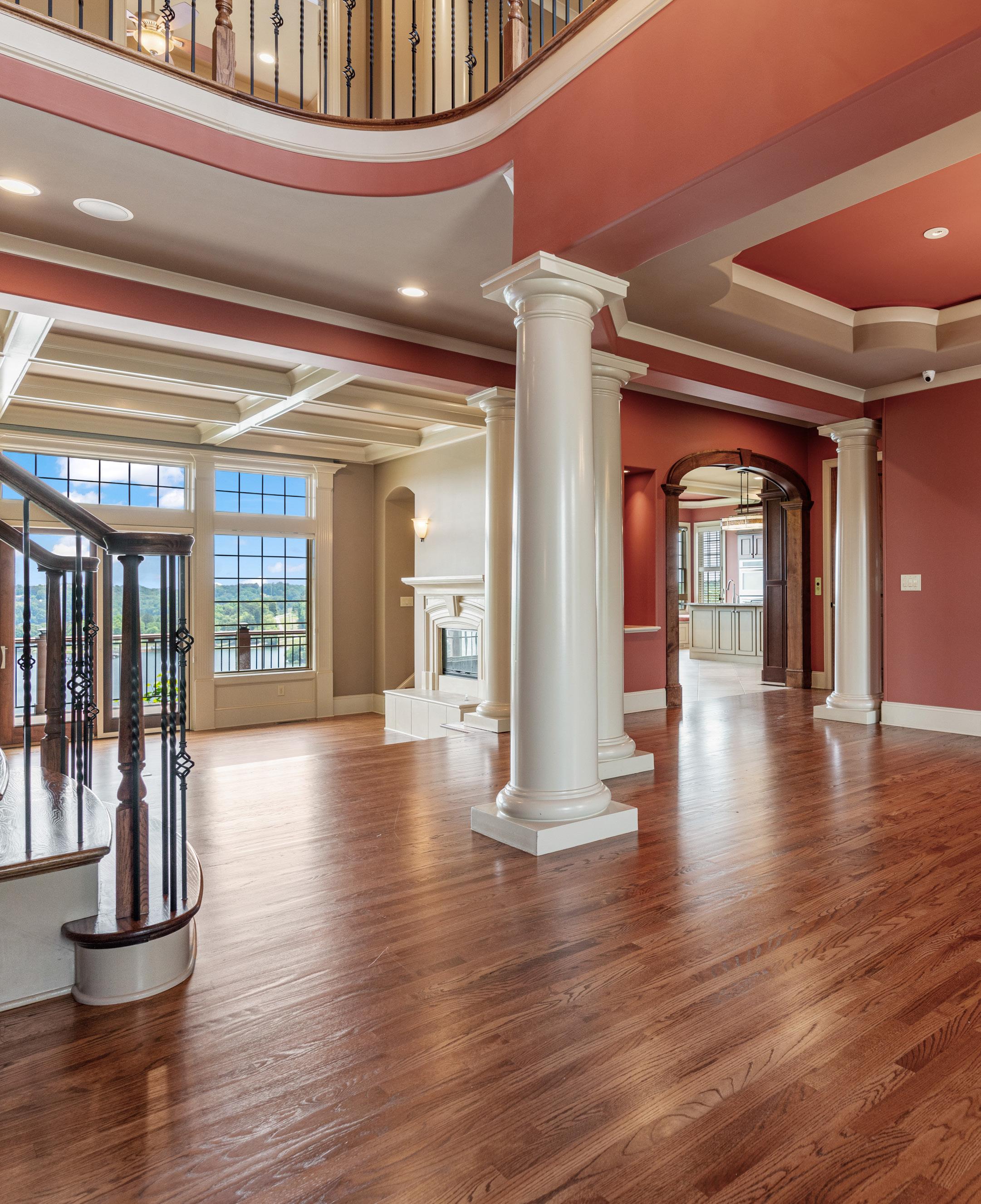 Perched atop one of Gainesville’s highest points, this custom Lake Lanier home offers stunning lake and mountain views. Set in an exclusive gated enclave, the three-level residence features elevator access, a brickand-stone exterior, and a classic barrel tile roof.