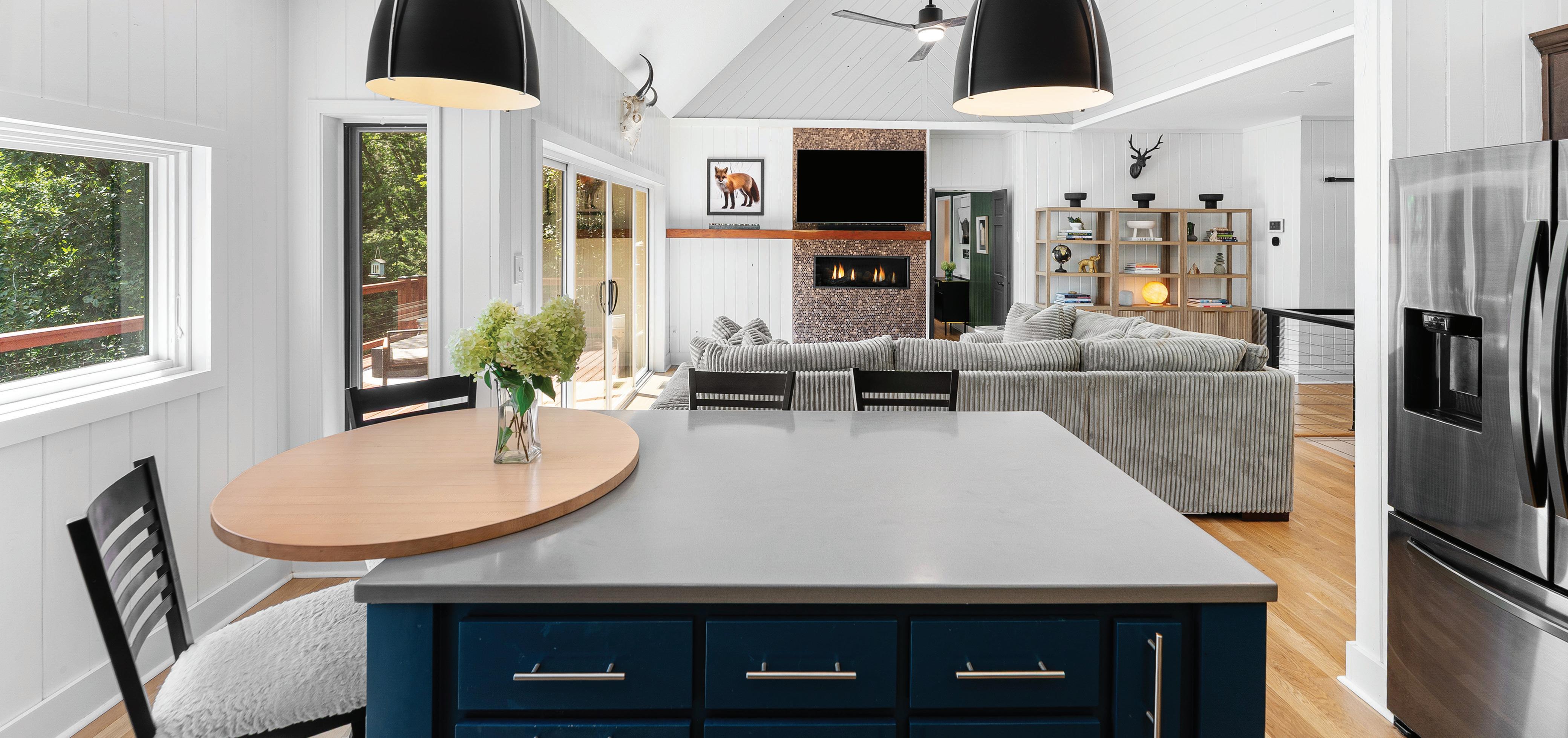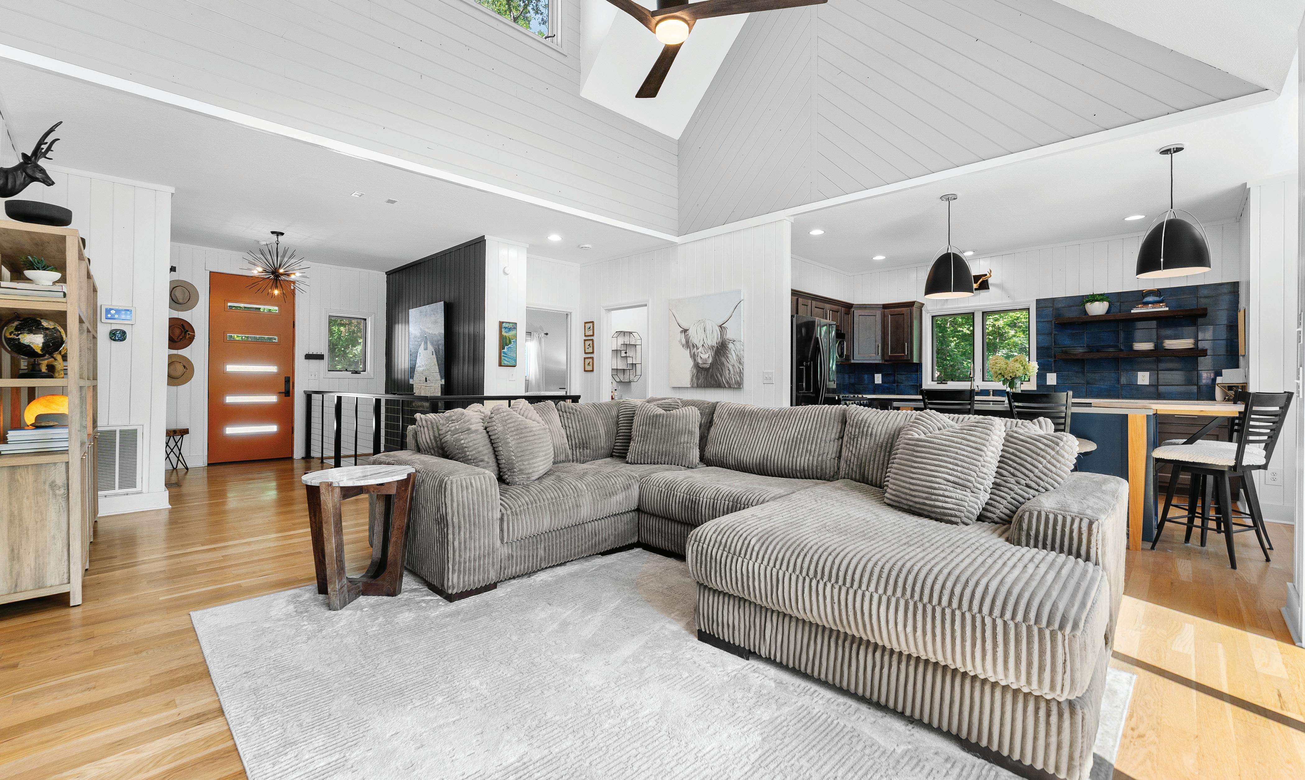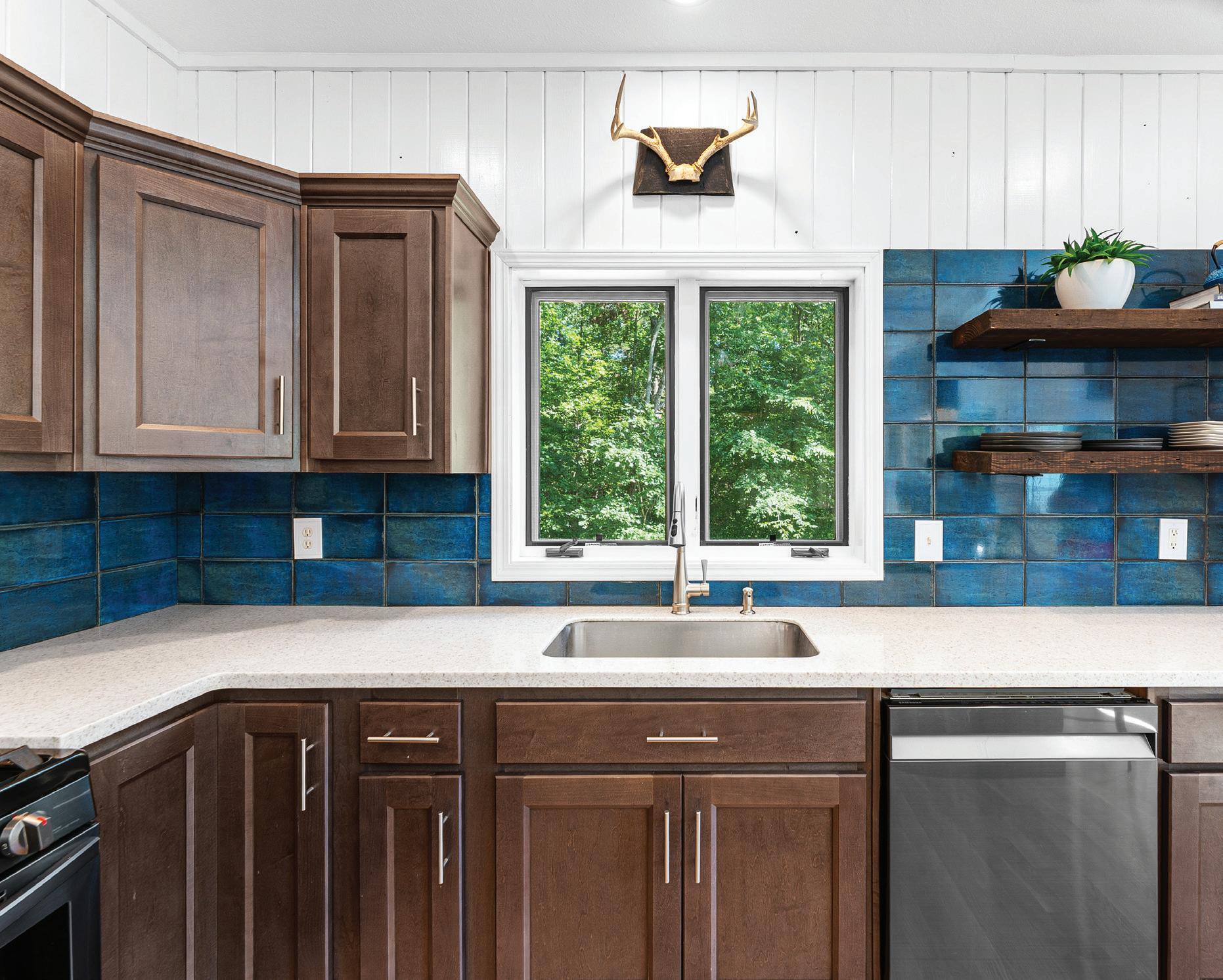 The main level offers two elegant primary suites and a show-stopping open kitchen with custom cabinetry, bold tilework, and a dramatic island. Vaulted ceilings, tongueand-groove paneling, and hardwood floors create warmth throughout, anchored by an electric fireplace with penny tile and a floating mantel. A 12-foot sliding door opens to a 45-foot deck, blending indoor and outdoor living.