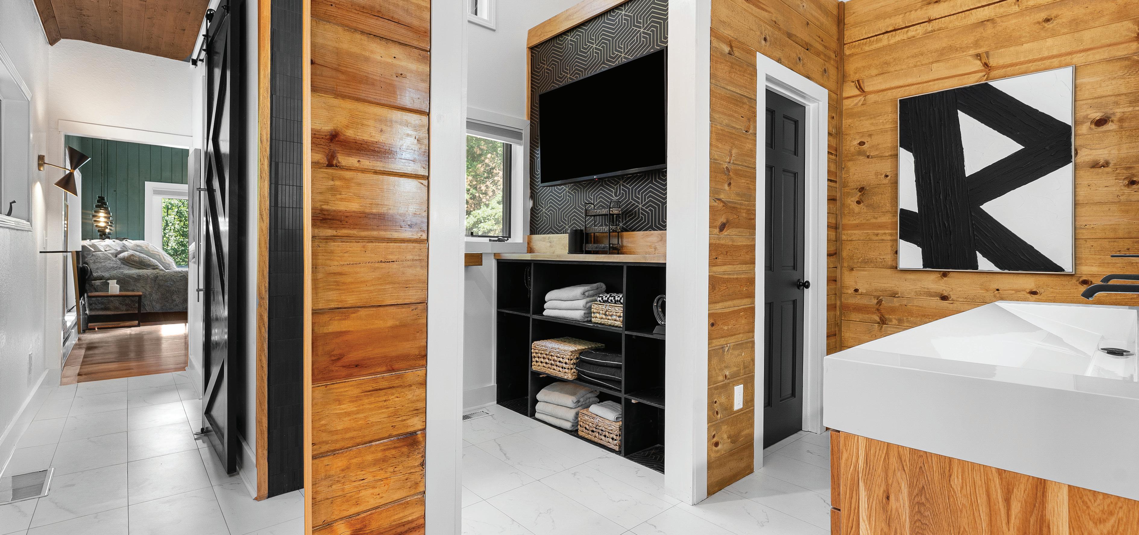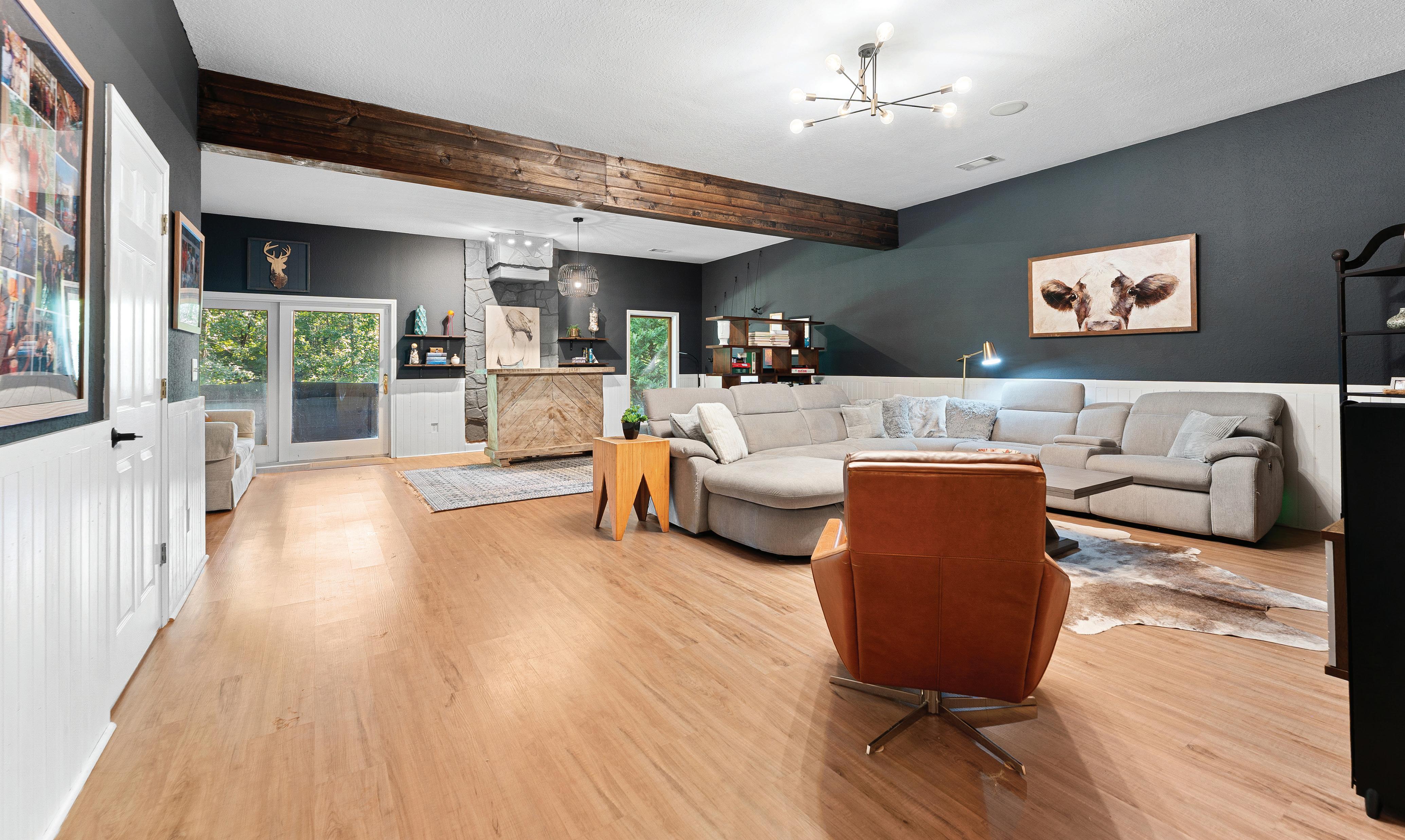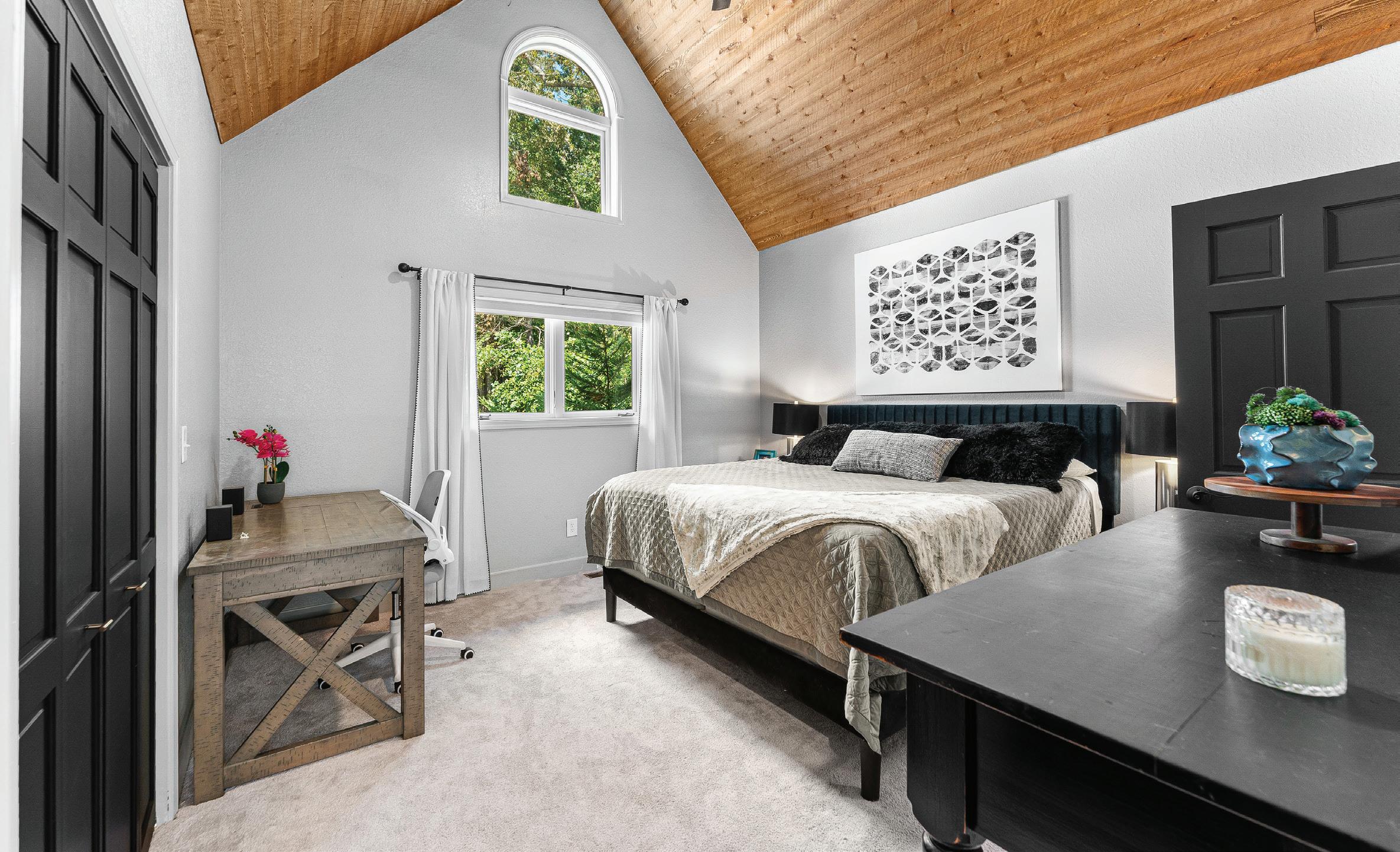 The main level offers two elegant primary suites and a show-stopping open kitchen with custom cabinetry, bold tilework, and a dramatic island. Vaulted ceilings, tongueand-groove paneling, and hardwood floors create warmth throughout, anchored by an electric fireplace with penny tile and a floating mantel. A 12-foot sliding door opens to a 45-foot deck, blending indoor and outdoor living.