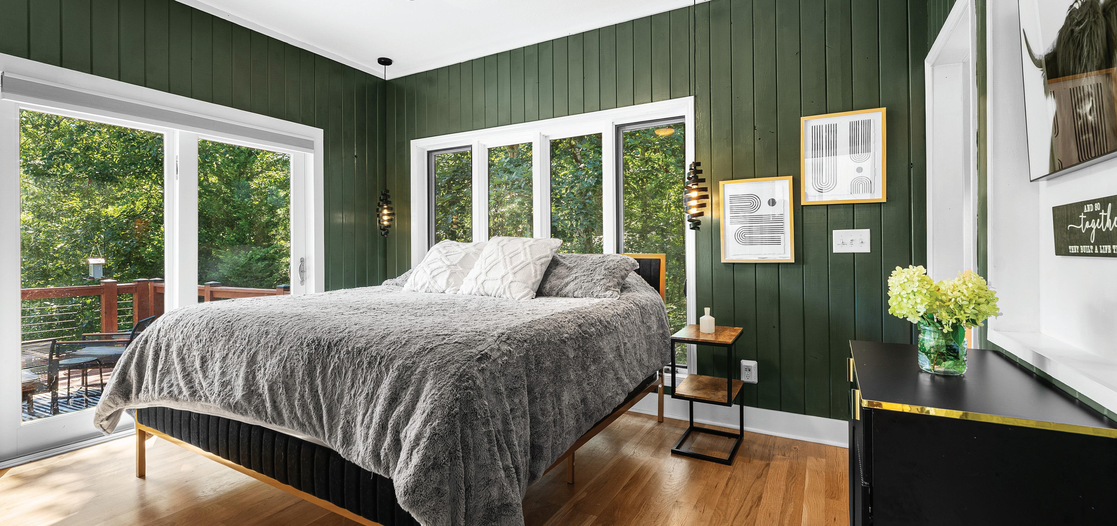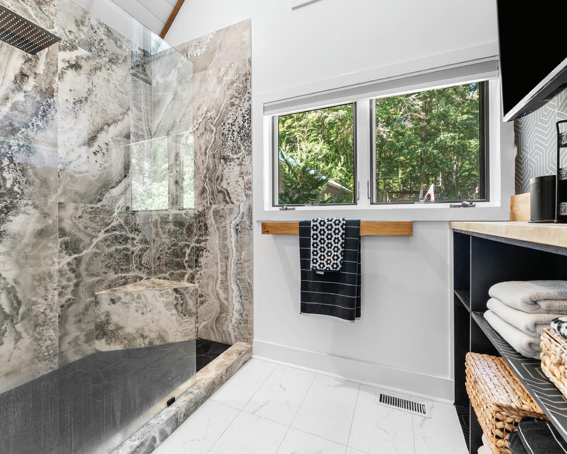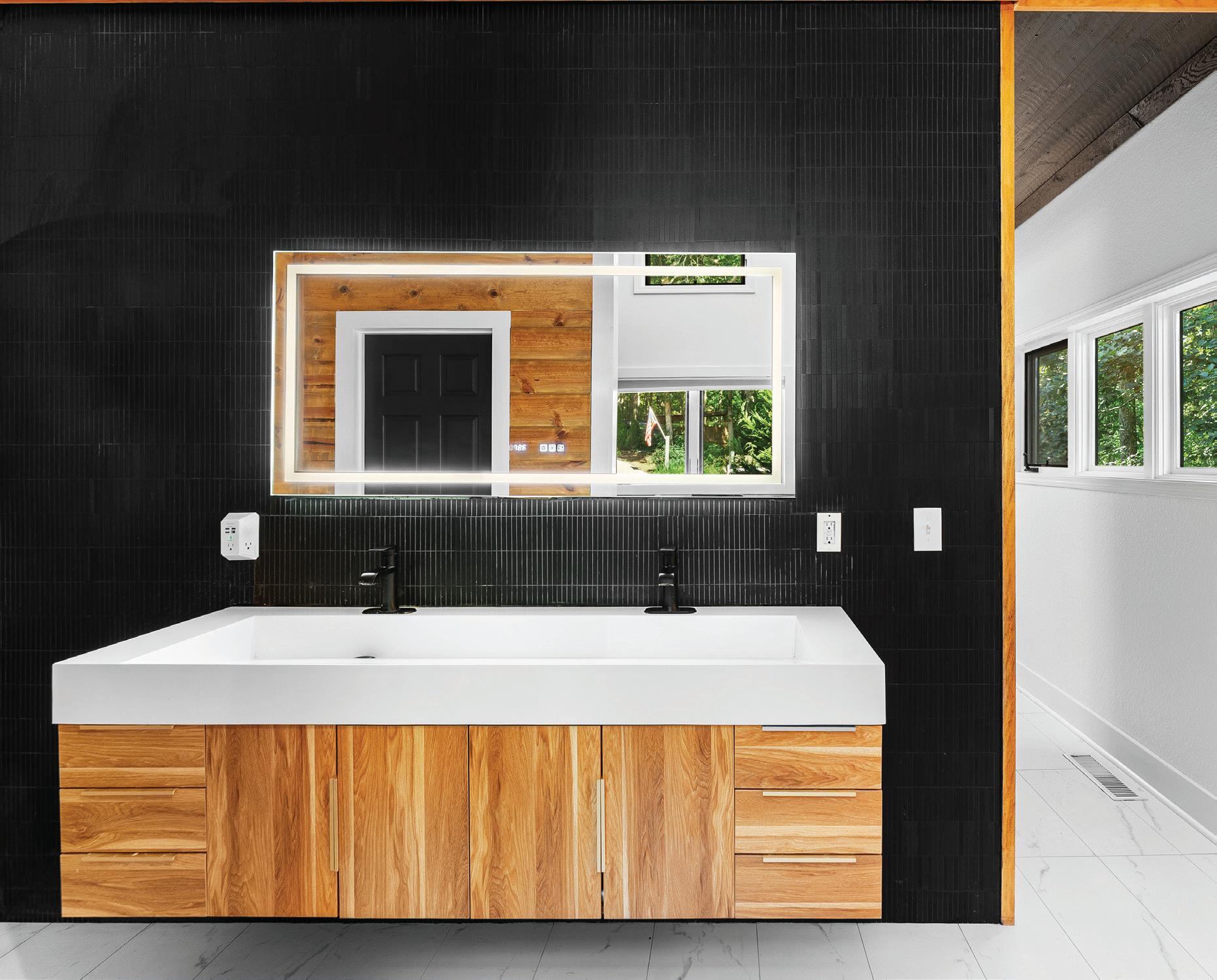 The primary suite is a serene retreat with deck access, sweeping views, a custom walk-in closet, and a spa-inspired bath with double trough sink, LED mirror, black tile accents, and oversized shower.