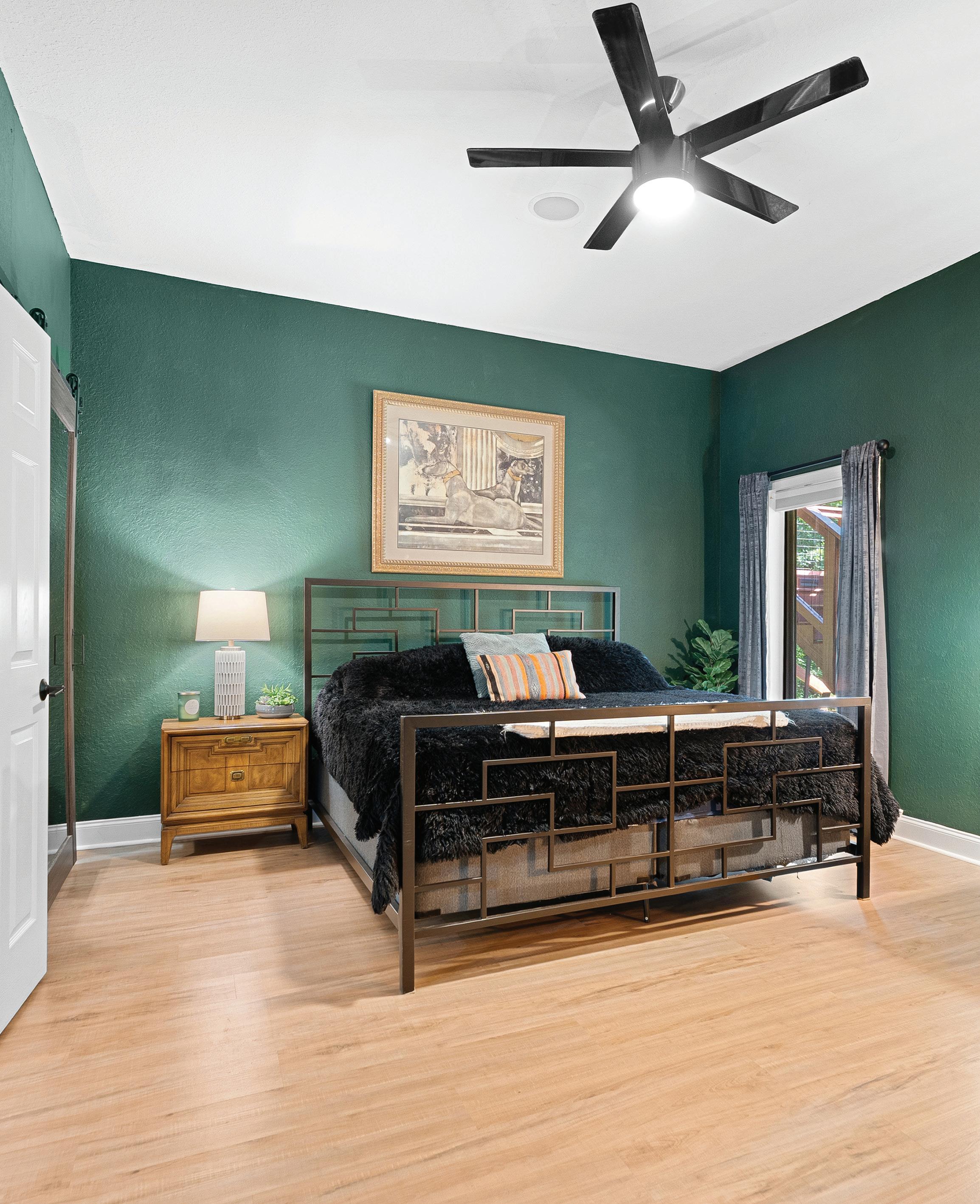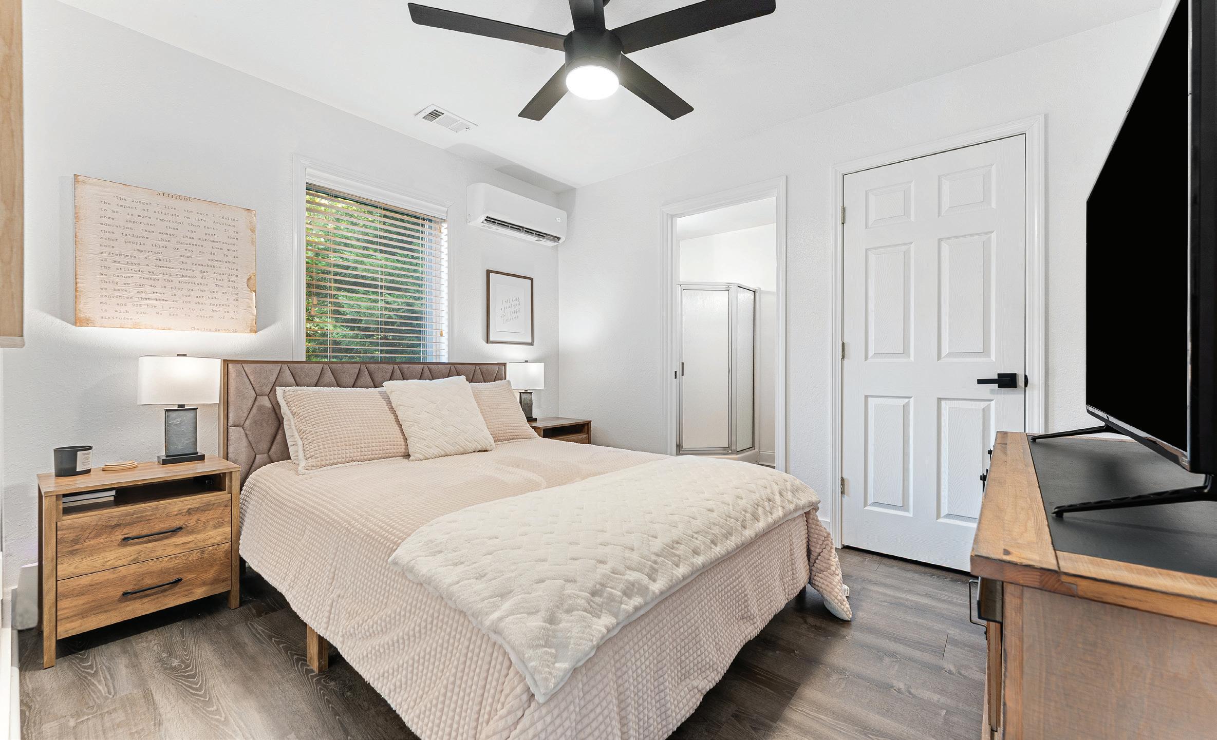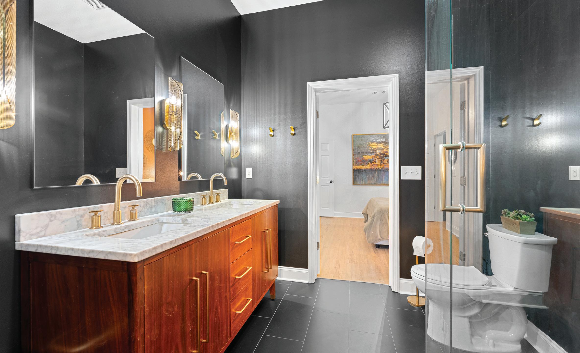The primary suite is a serene retreat with deck access, sweeping views, a custom walk-in closet, and a spa-inspired bath with double trough sink, LED mirror, black tile accents, and oversized shower.