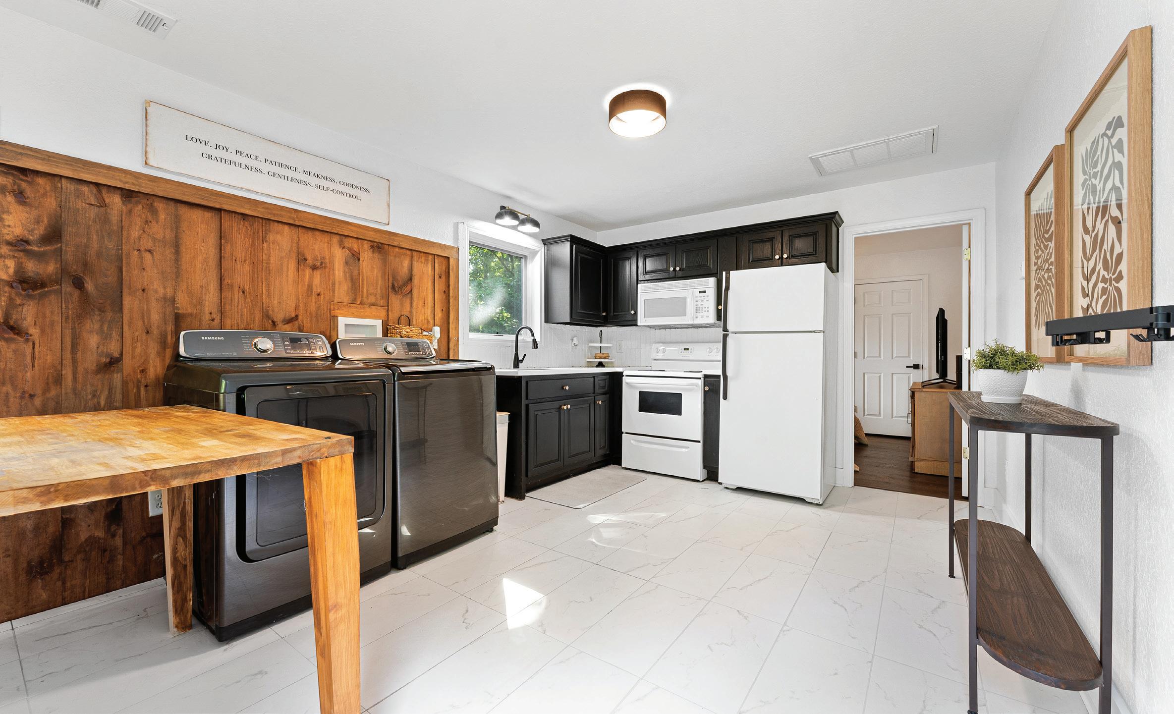 A standout feature is the oversized 3-bay garage with 10-foot doors, 12-foot ceilings, a workbench, and built-in shelving — perfect for car enthusiasts. Just off the garage is a private guest suite with its own kitchen, bath, laundry, and walk-in closet. A fully floored attic above offers extra storage or future potential.