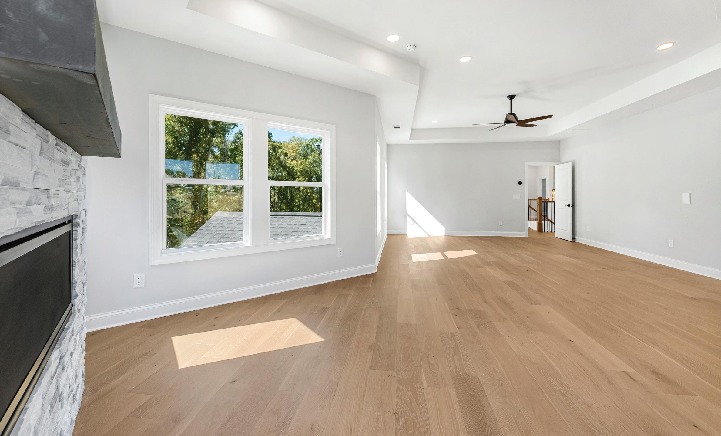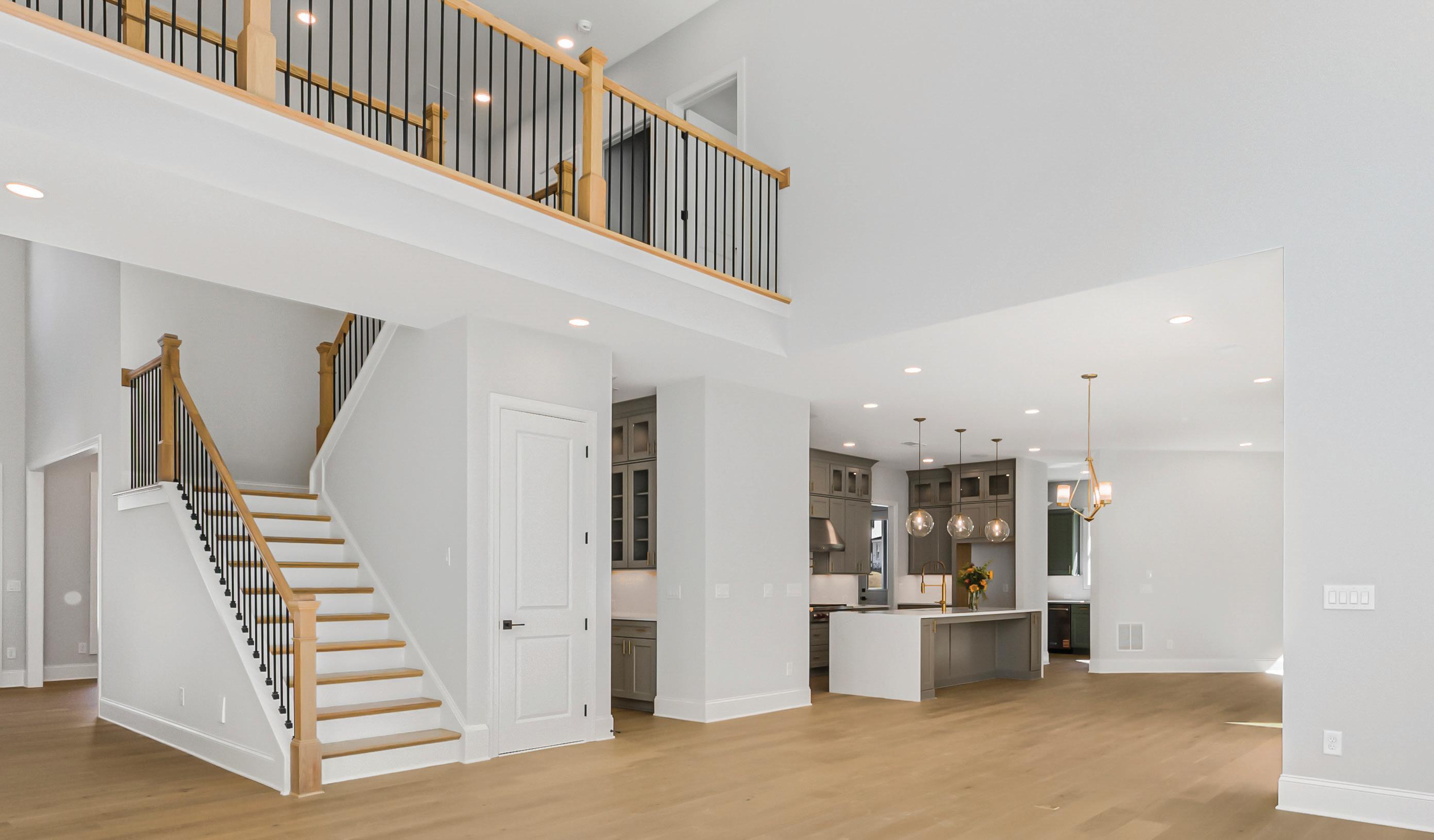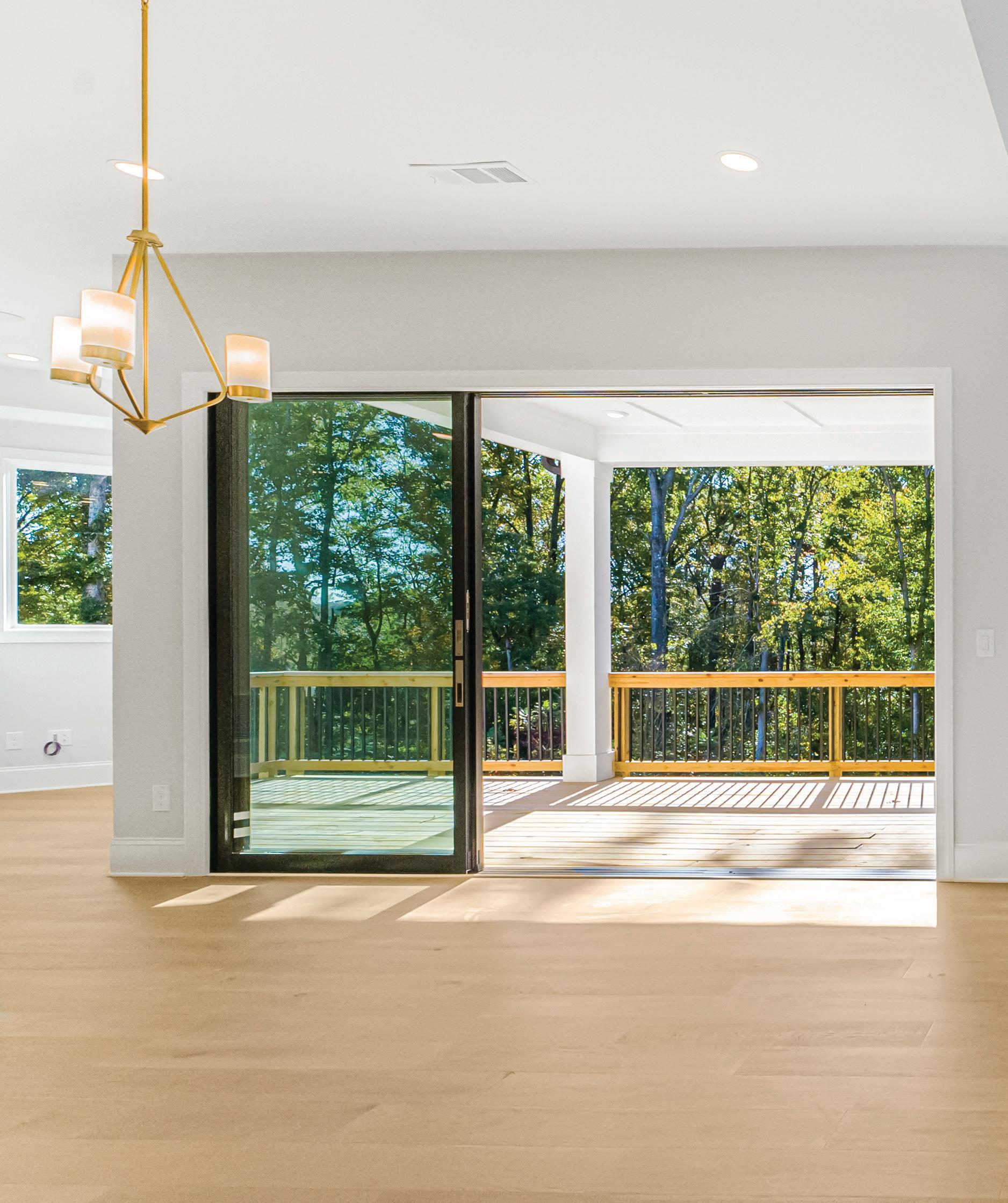At the heart of the home, the chef’s kitchen is a showpiece with waterfall quartz countertops, ceiling-height illuminated cabinetry, Wolf appliances, and a spacious walk-in pantry. A secondary prep kitchen adds a second gas cooktop and extra storage—ideal for entertaining. The family room’s stacked-stone fireplace soars to the ceiling, while a three-panel slider opens to a covered porch and grilling deck overlooking the flat, private backyard. A mainlevel guest suite, mudroom with side entry, and three-car garage with dual EV outlets add everyday convenience.