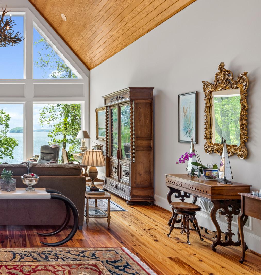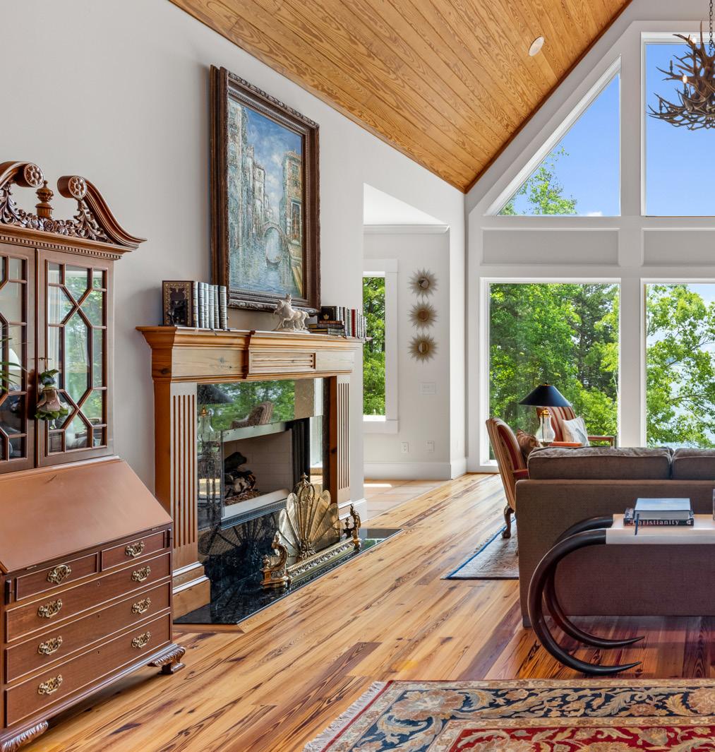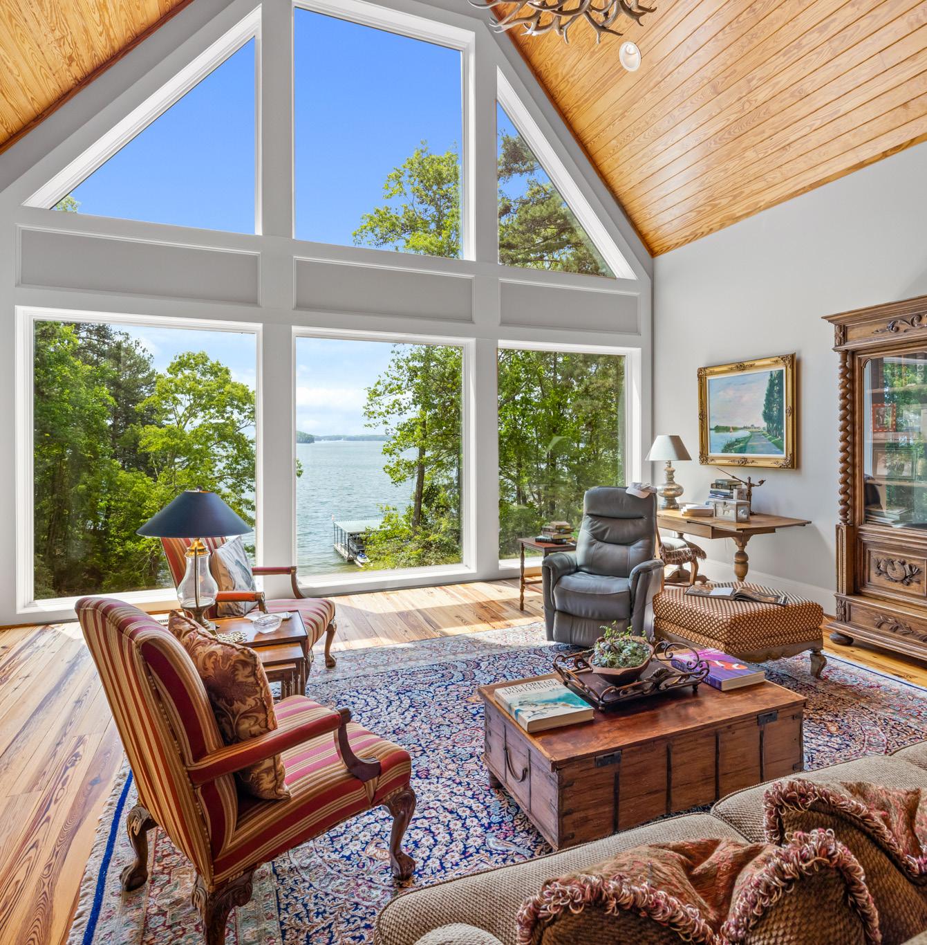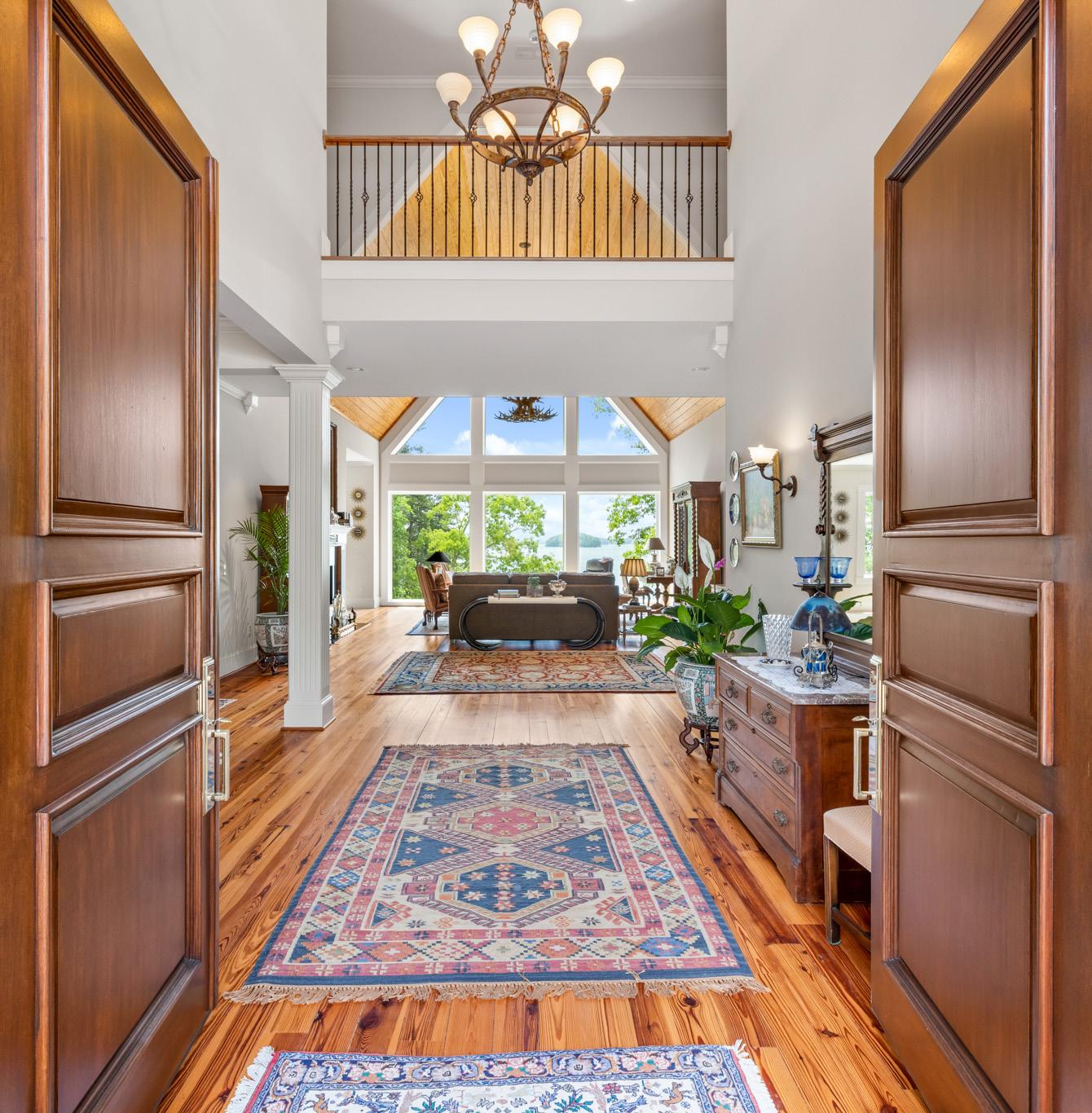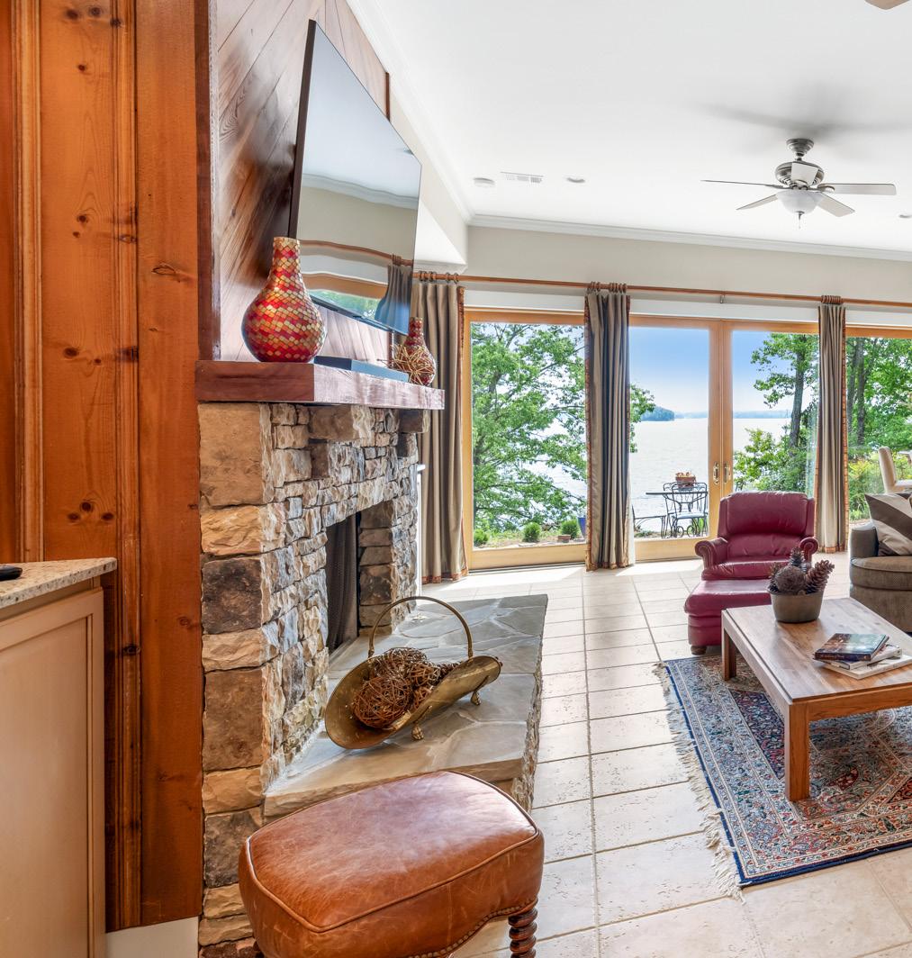 Outstanding construction of Beachwood Cottage is evident with the finest of woods, Kolbe & Kolbe windows, design elements and materials. Heart pine floors adorn the first level with 18'' square tiles in the remaining spaces. Eleven foot ceilings, five foot hallways and staircases are impressive features. The flat winding paver driveway and large courtyard enhance the grand entrance and lead to a twocar garage plus another two-car garage on the terrace level. Magnificent oversized custom mahogany double doors greet you at the entrance and when opened offer the first awesome view of the lake through massive cathedral windows in the great room. Arched pine ceiling and antler chandelier give a grandiose quality to this space. One can peek through the double-sided fireplace into the adjacent keeping room, highlighted by the natural stacked stone and wood mantel see-through fireplace.