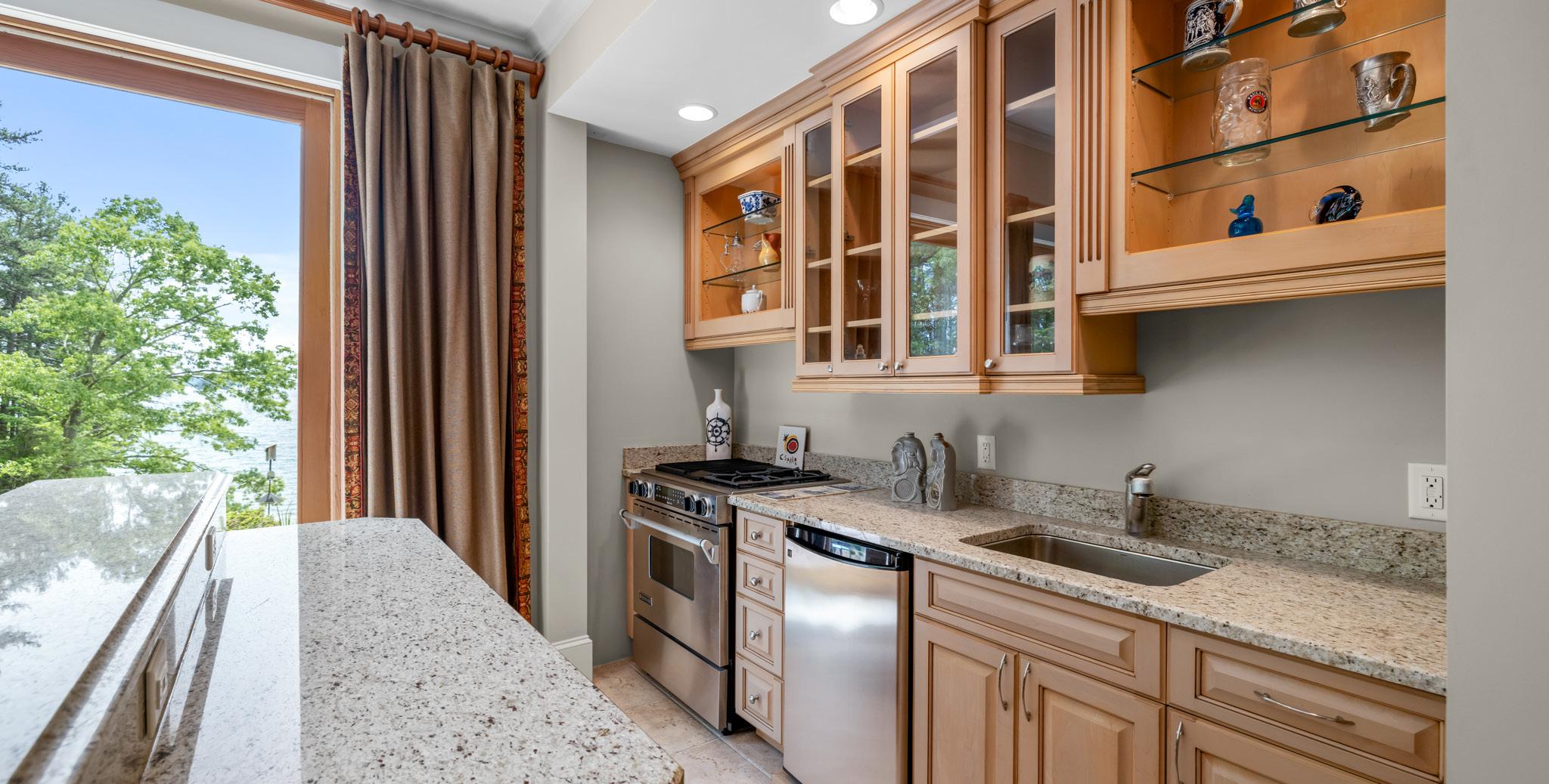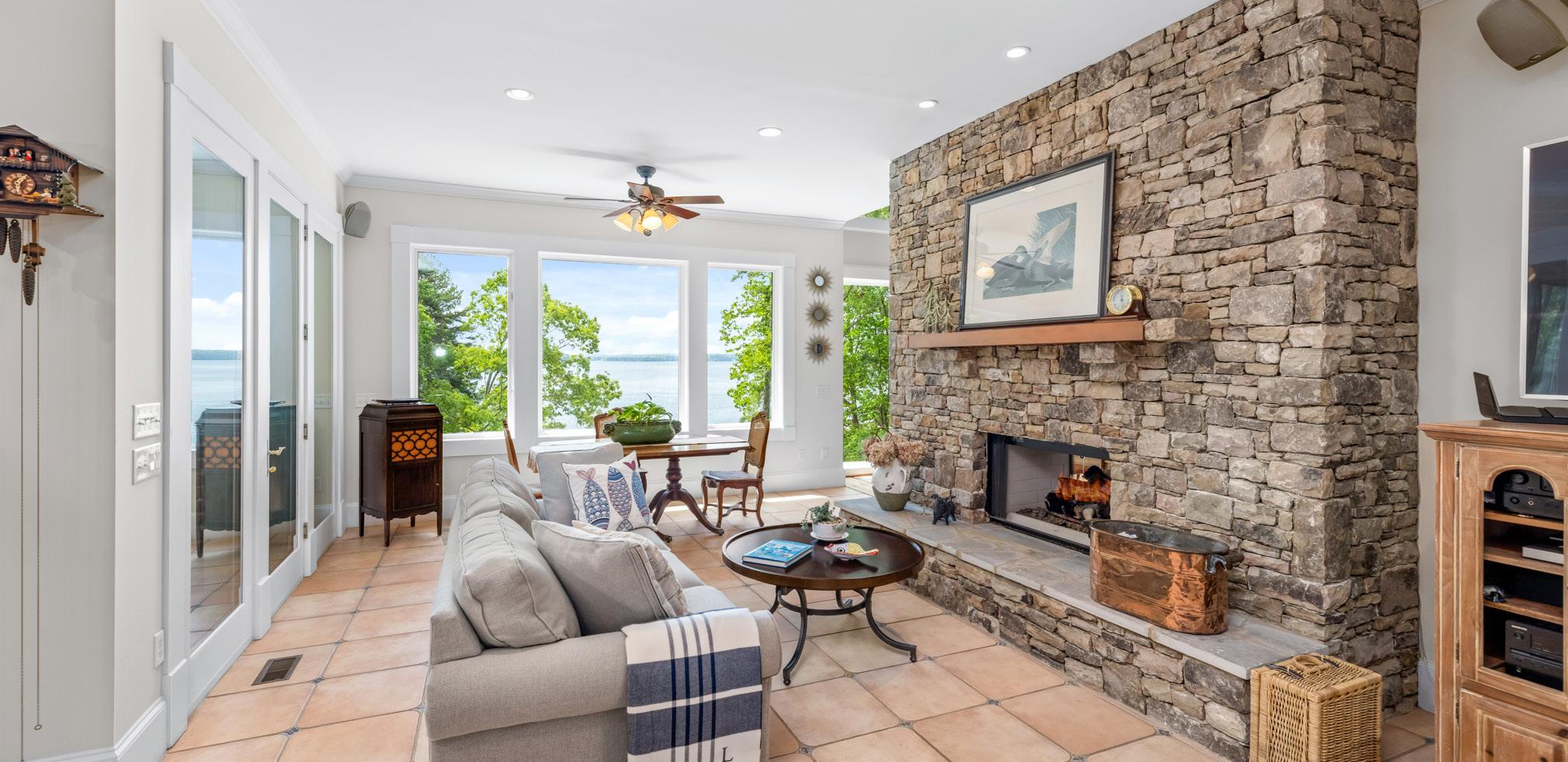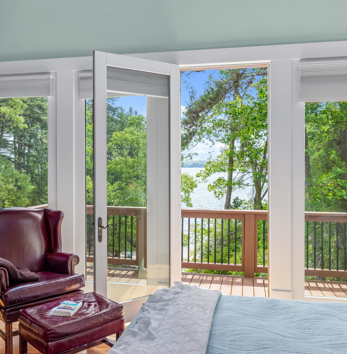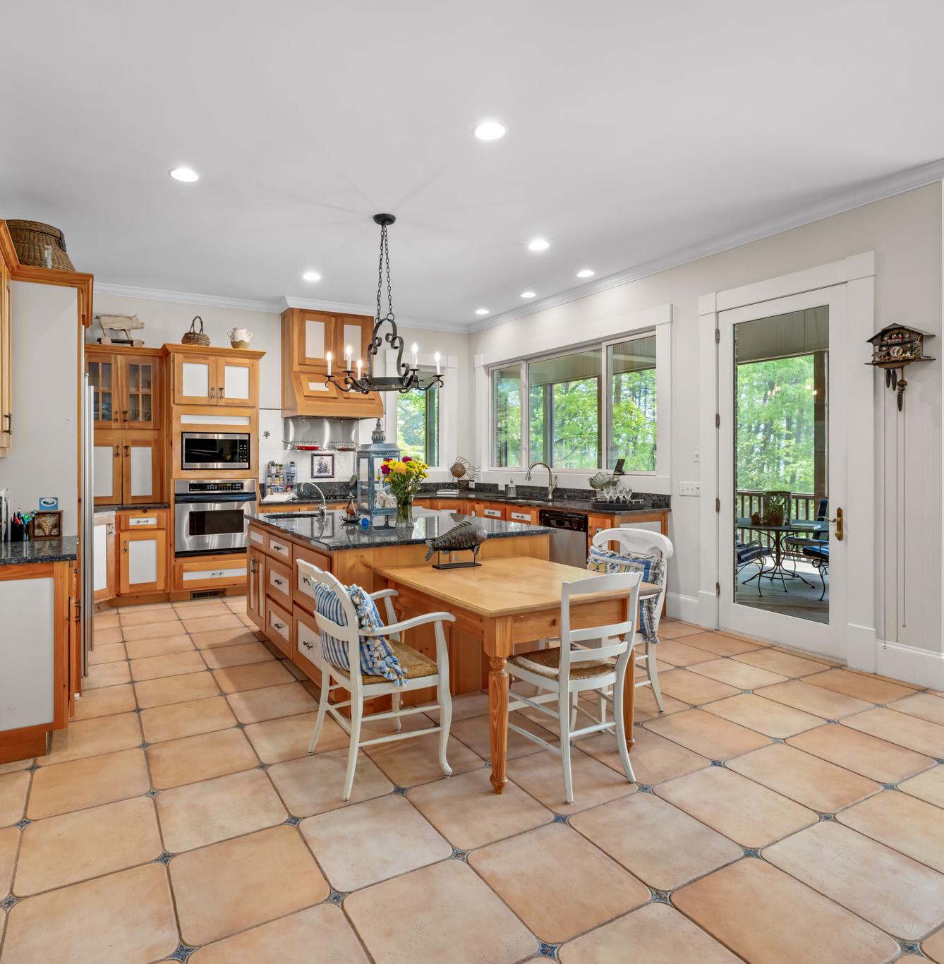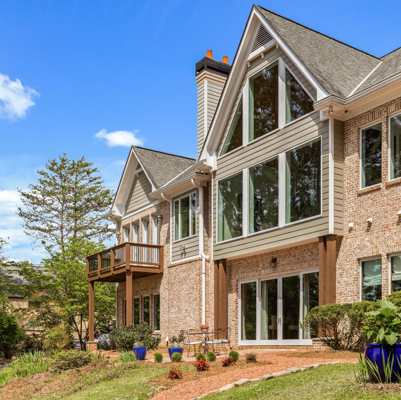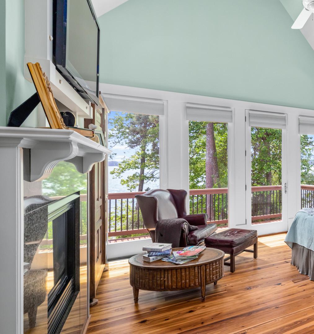 Outstanding construction of Beachwood Cottage is evident with the finest of woods, Kolbe & Kolbe windows, design elements and materials. Heart pine floors adorn the first level with 18'' square tiles in the remaining spaces. Eleven foot ceilings, five foot hallways and staircases are impressive features. The flat winding paver driveway and large courtyard enhance the grand entrance and lead to a twocar garage plus another two-car garage on the terrace level. Magnificent oversized custom mahogany double doors greet you at the entrance and when opened offer the first awesome view of the lake through massive cathedral windows in the great room. Arched pine ceiling and antler chandelier give a grandiose quality to this space. One can peek through the double-sided fireplace into the adjacent keeping room, highlighted by the natural stacked stone and wood mantel see-through fireplace.