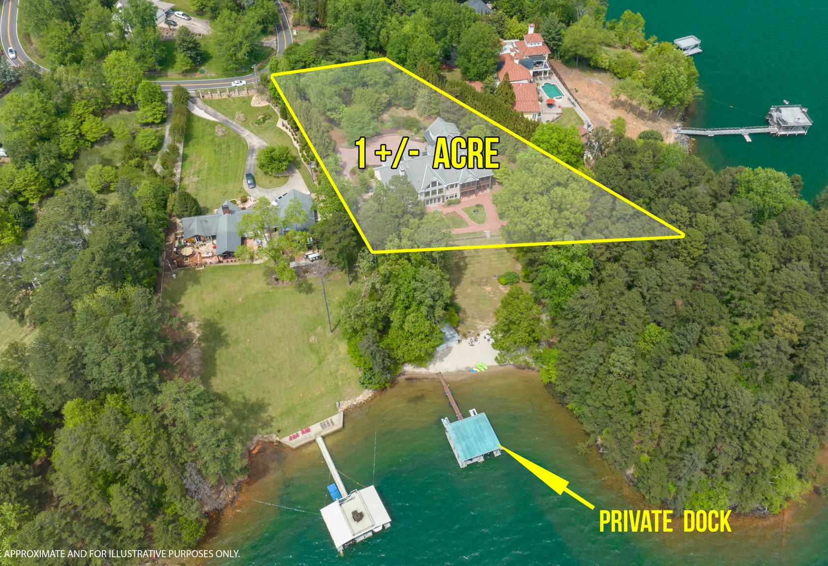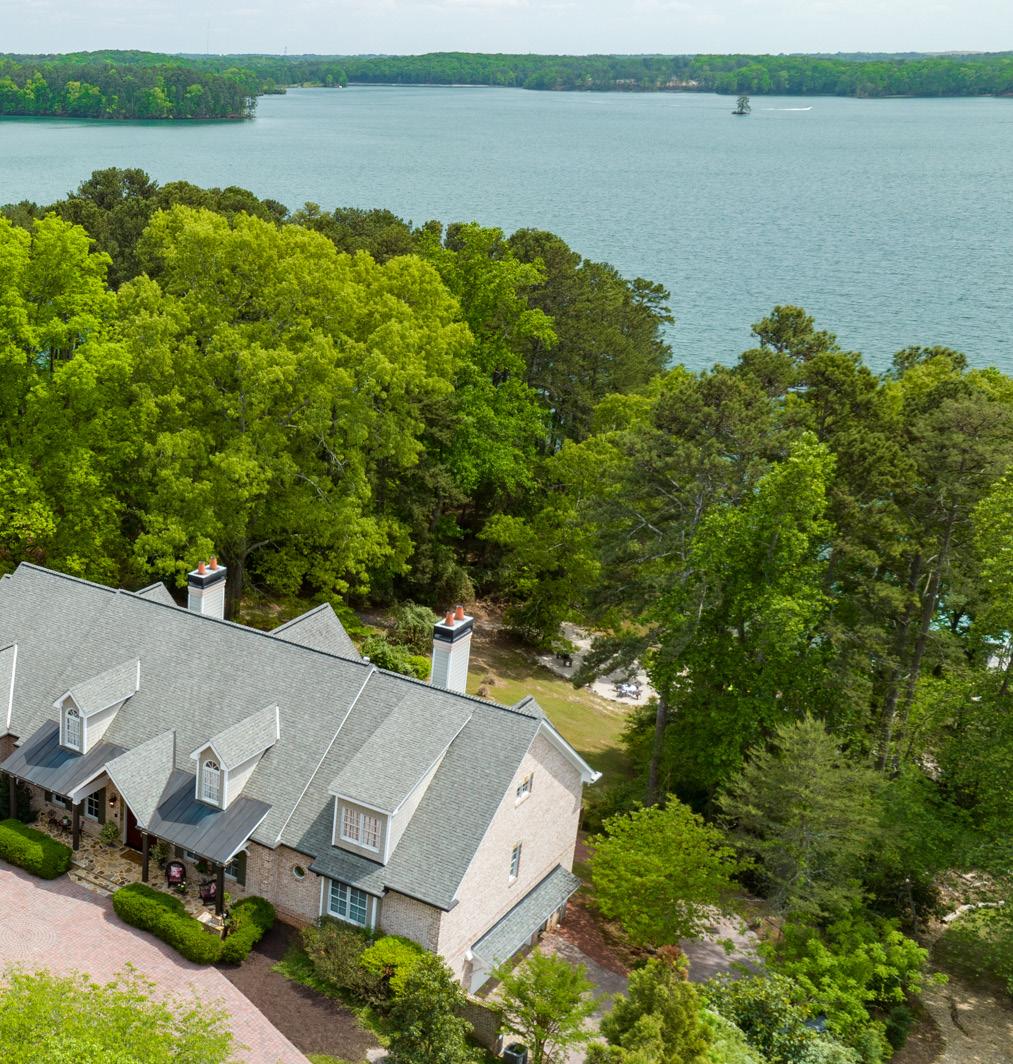 Wide 51'' heart pine stairs lead to the terrace level that also boasts eleven foot ceilings in most areas. One discovers a gym room and also two additional guest bedrooms and bath. Both have excellent lake views and offer different perspective scenes of the lake. Doors connect each of the bedrooms and bath to a covered veranda ideal for cookouts and family gatherings. A large family room with stacked stone log or gas fireplace and adjacent kitchenette has sizable sliding glass doors that open to a paver patio. Small crimson rock pathways and road in the back surround landscaped areas, offering vital access to all of the property. A vintage ivy covered concrete block out-building can be a potting shed or storage. The private location of this prestigious quality custom built home, easy access to GA 400 and Atlanta, a panoramic lake view with a natural sandy beach make Beachwood Cottage a unique and unforgettable place to call home.