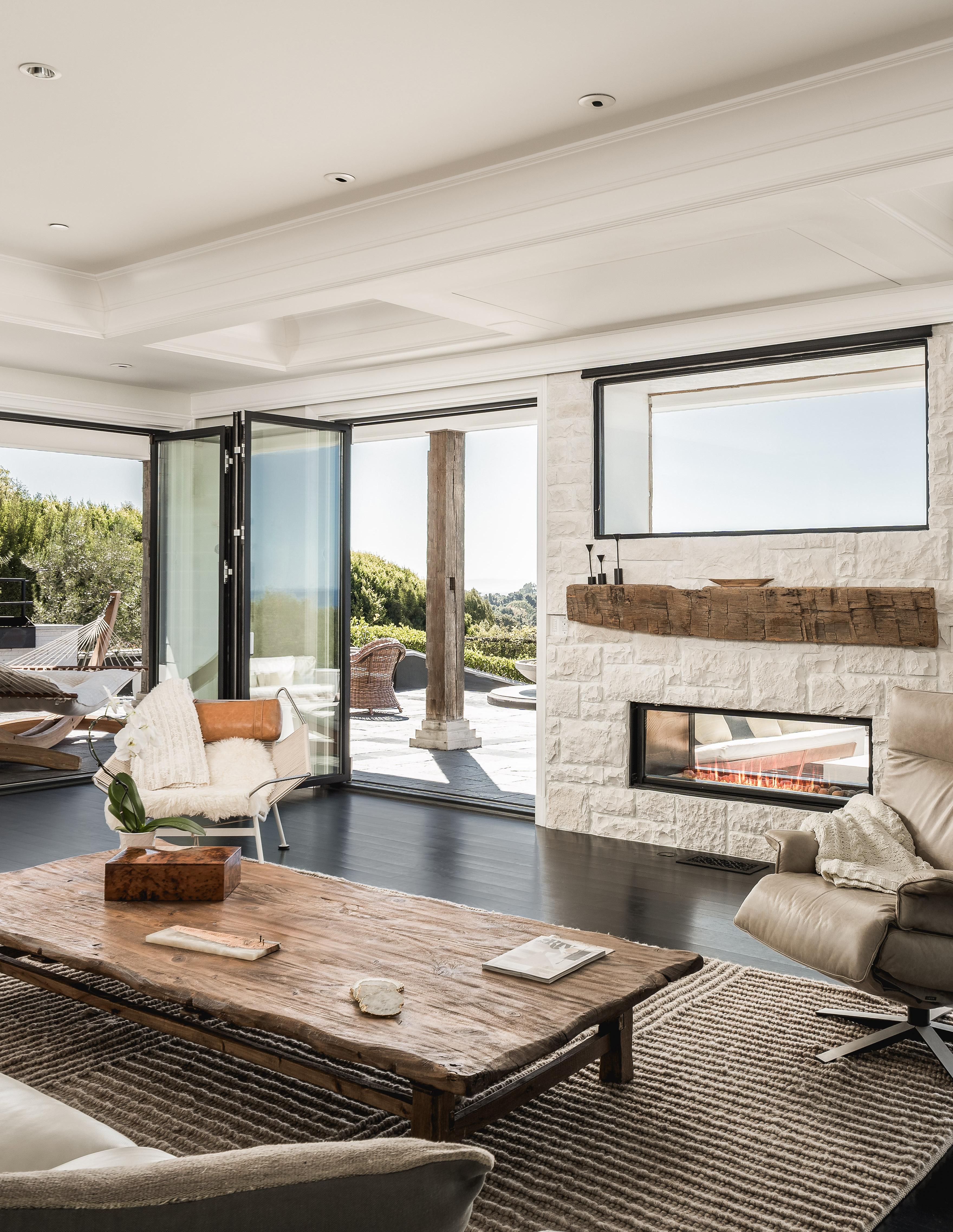 Originally designed by renowned architect Barry Berkus, the estate has been extensively renovated and thoughtfully modernized. The exterior façade features stone finishes, antique wood pillar columns, and custom glass doors that frame sweeping views of the Pacific the moment you arrive.