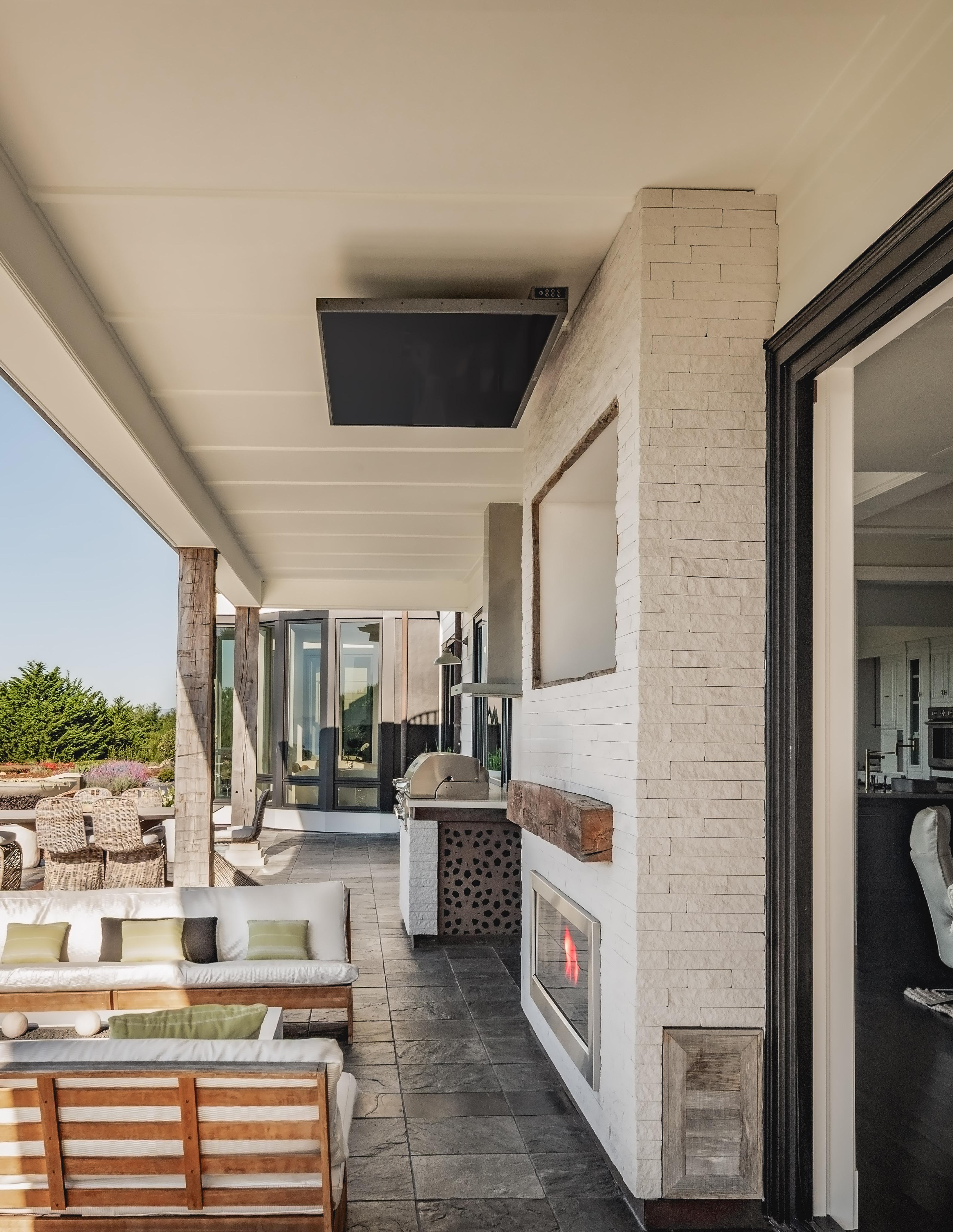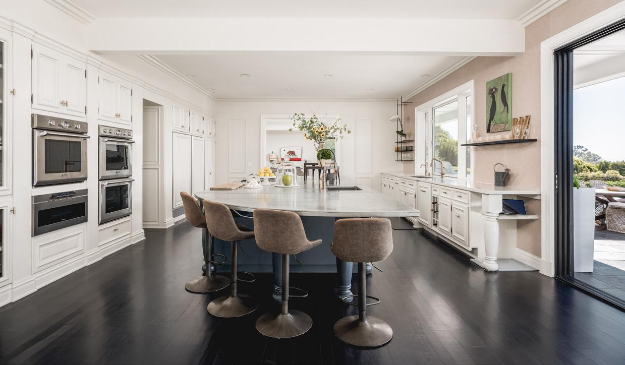 Inside, light and space flow effortlessly throughout the open layout, connecting the family room, kitchen, and dining room for easy living and memorable entertaining. The chef’s kitchen is a true showpiece—anchored by a 16’ x 6.5’ zinc-wrapped island and appointed with a La Cornue range, Sub-Zero refrigeration, three ovens, three sinks, and a walk-in pantry. A pass-through window opens to the ocean view terrace with dual barbecue stations and a covered dining area.