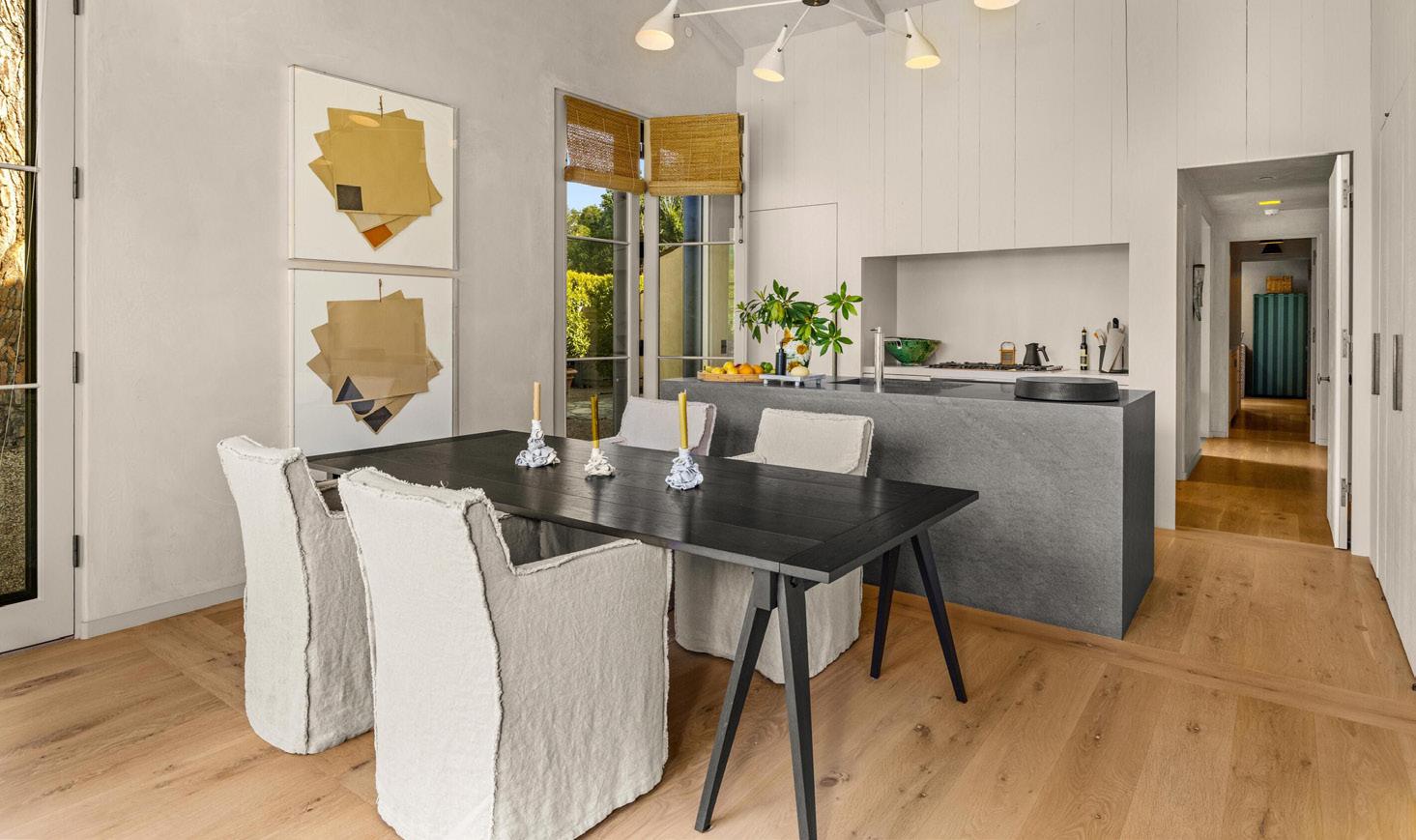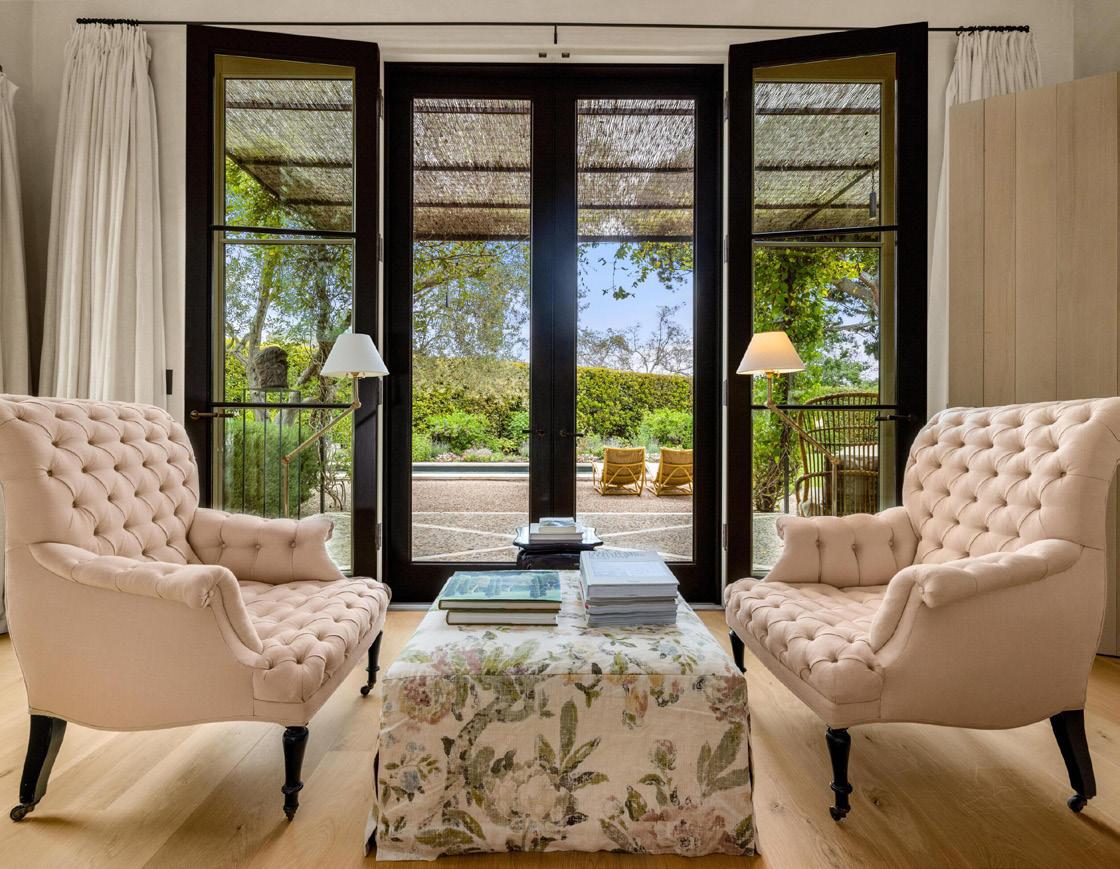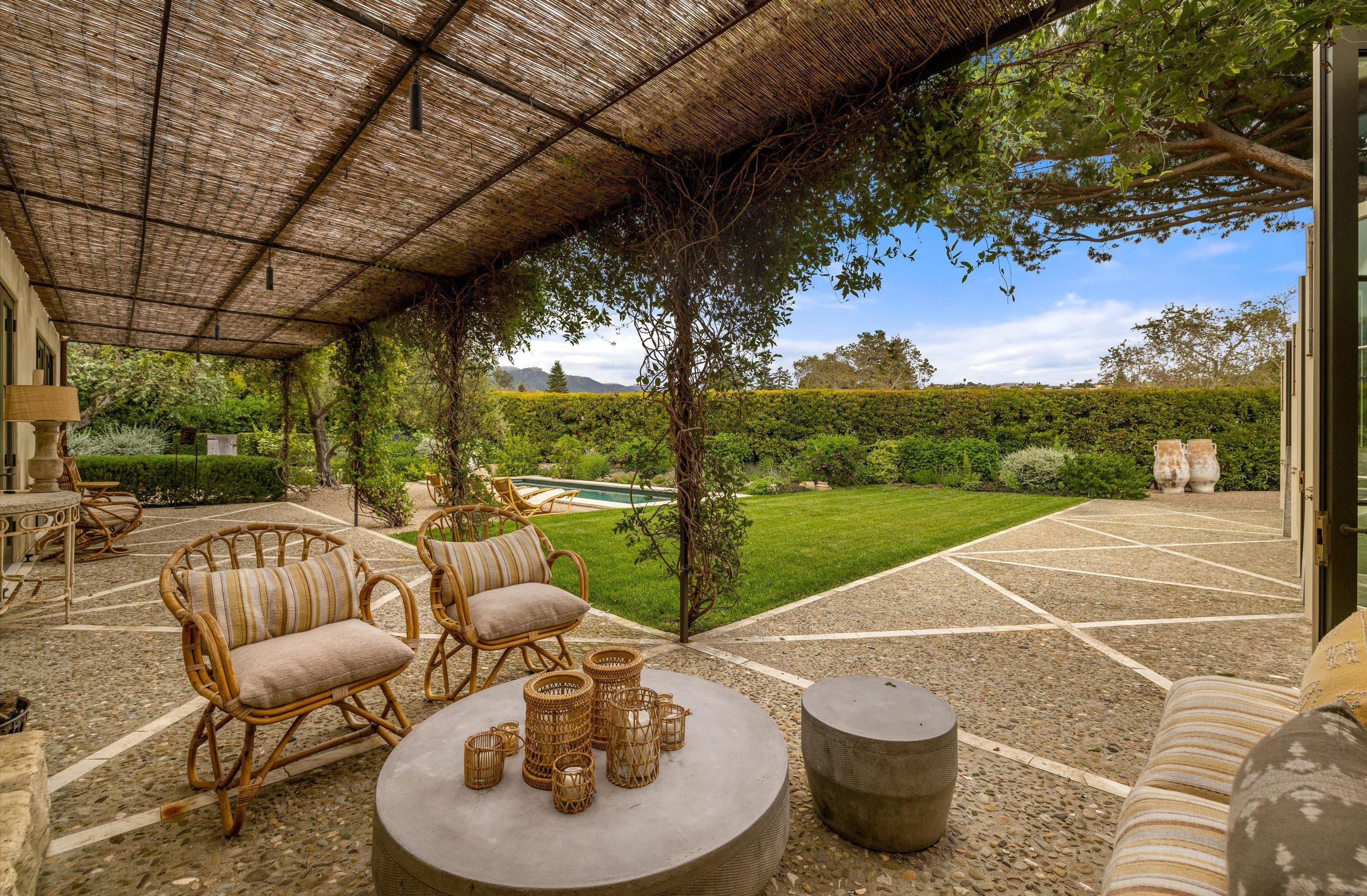 The stunning gourmet kitchen hosts a custom island made of basalt stone, walls of storage, elegant French doors that open to the garden, and beautiful views of the Santa Ynez mountains.
