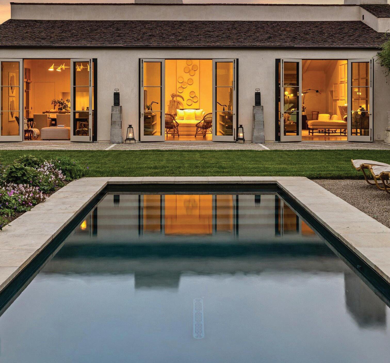 The stunning gourmet kitchen hosts a custom island made of basalt stone, walls of storage, elegant French doors that open to the garden, and beautiful views of the Santa Ynez mountains.