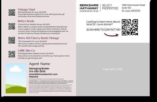 This design is front and back to recommend shops in the area. There is a spot on the back for agent personalization and mailing information. Additionally, the QR code encourages readers to reach out Postcard