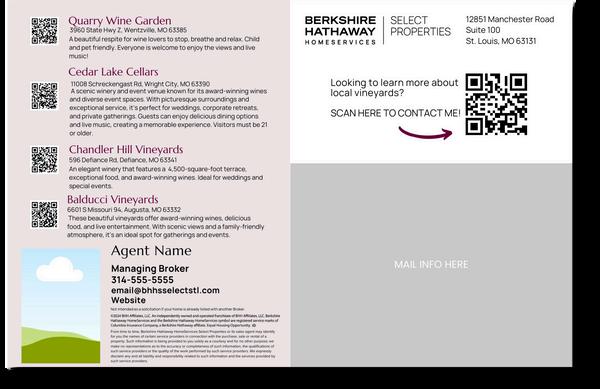 This design is front and back to recommend vineyards in the area There is a spot on the back for agent personalization and mailing information Additionally, the QR code encourages readers to reach out.