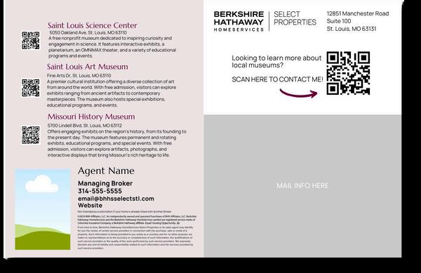 This design is front and back to recommend museums in the area There is a spot on the back for agent personalization and mailing information Additionally, the QR code encourages readers to reach out.