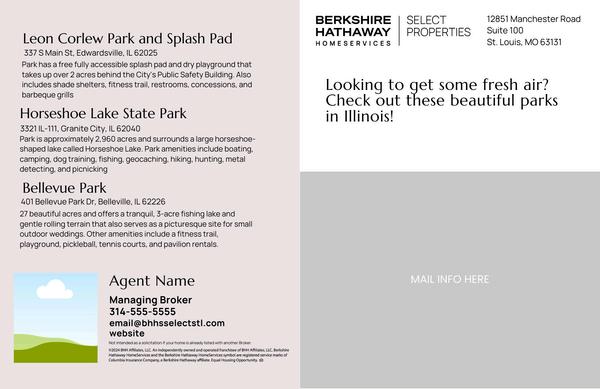 This design is front and back to recommend parks in the area There is a spot on the back for agent personalization and mailing information Additionally, the QR code encourages readers to reach out.