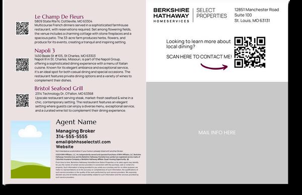 This design is front and back to recommend restaurants in the area There is a spot on the back for agent personalization and mailing information Additionally, the QR code encourages readers to reach out.