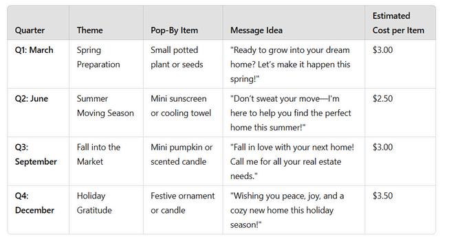 Pop-By: Deliver branded notepads or pens with the agent’s contact details for a simple, usable gift
