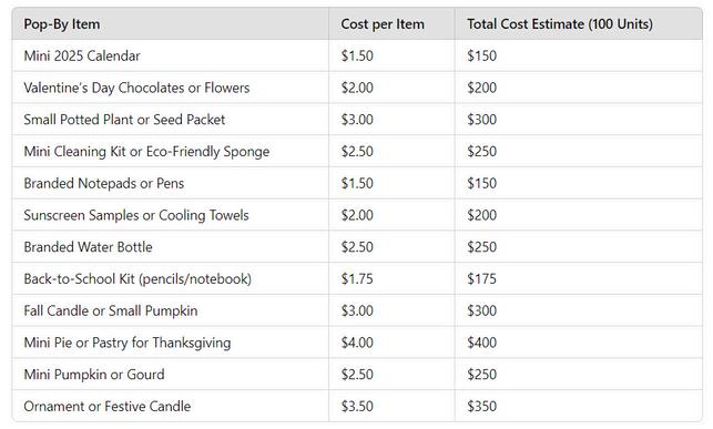 Below is a rough cost estimate for pop-bys; both monthly and quarterly options