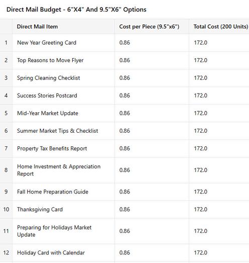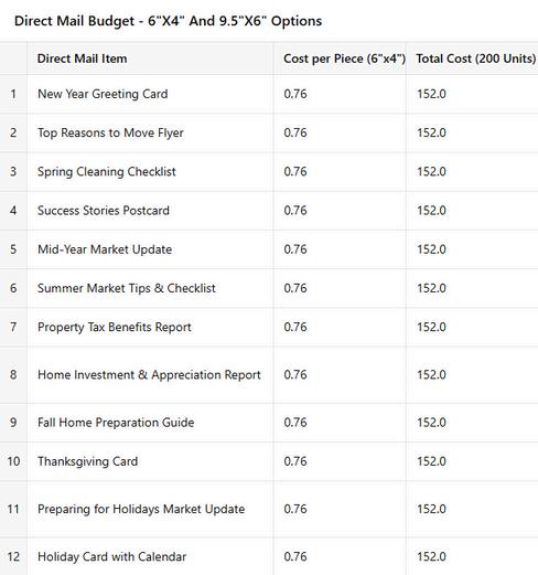 Personal Marketing Co. offers two sizes; 6"x4" and 9.5"x6". The below totals cover the entire 12-month campaign for 200 units per month designed, printed and mailed