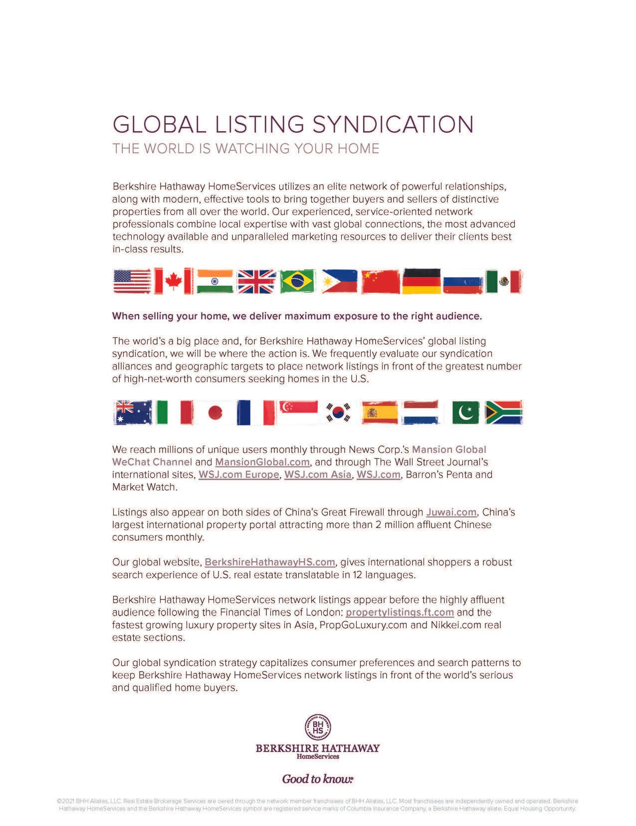 The world’s a big place and, for Berkshire Hathaway HomeServices’ global listing syndication, we will be where the action is We frequently evaluate our syndication alliances and geographic targets to place network listings in front of the greatest number of high-net-worth consumers seeking homes in the U S