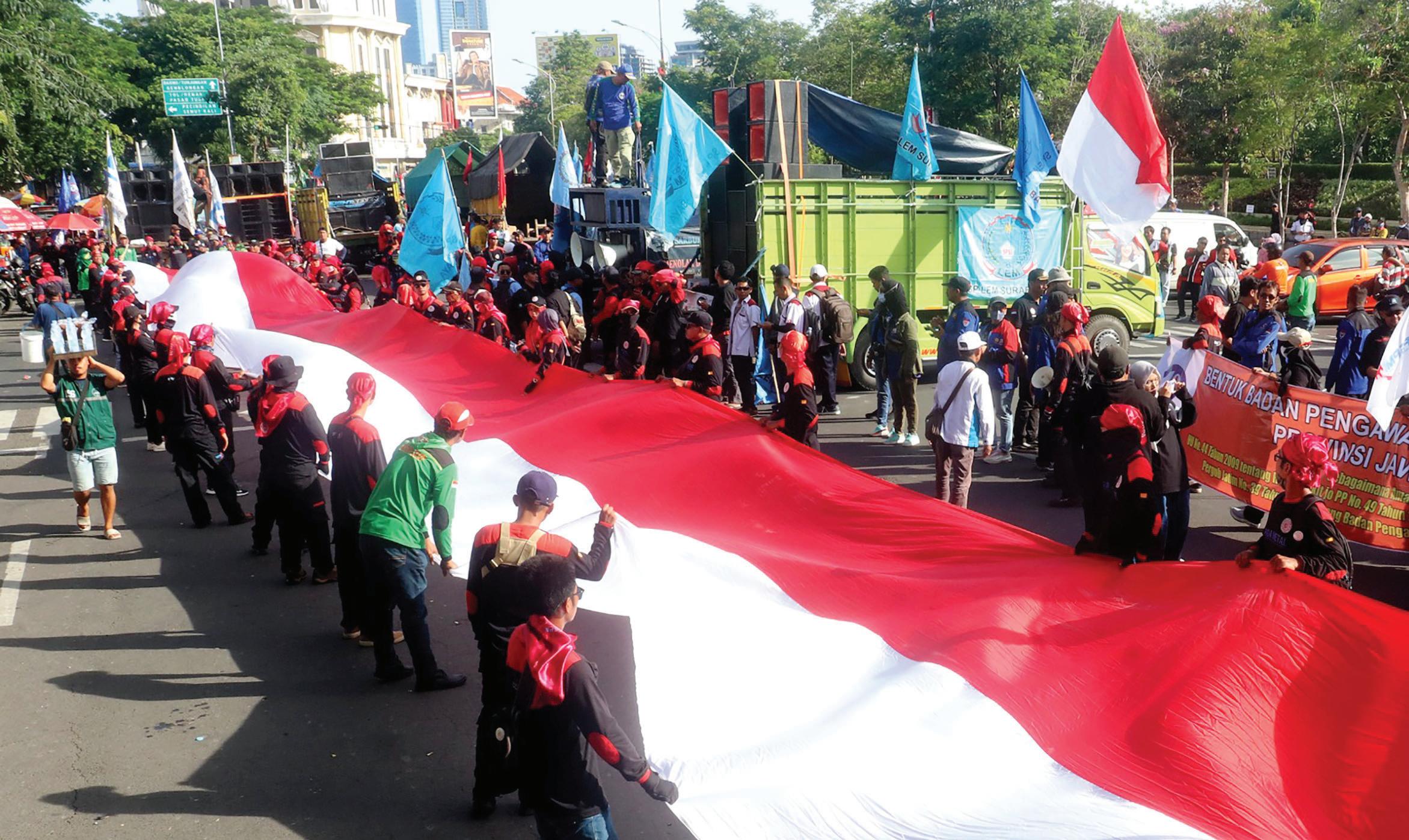 ya Lamongan, Tuban, Pasuruan, Jombang, Malang, Probolinggo, Jember, Lumajang, dan Banyuwangi. Dalam Hari Buruh 2024 ini para demontran juga membawa tuntutan untuk diorasika di depan Kantor Gubernur Jawa Timur. Kordinator Konfederasi Serikat Buruh Seluruh Indonesia (KSBSI) Sugeng mengatakan menuntut pemerintah