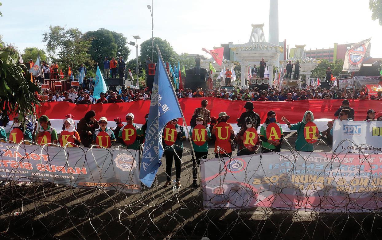 Dalam aksi itu, kelompok serikat pekerja buruh menyodorkan 12 tuntutan aspirasi ke halaman 11