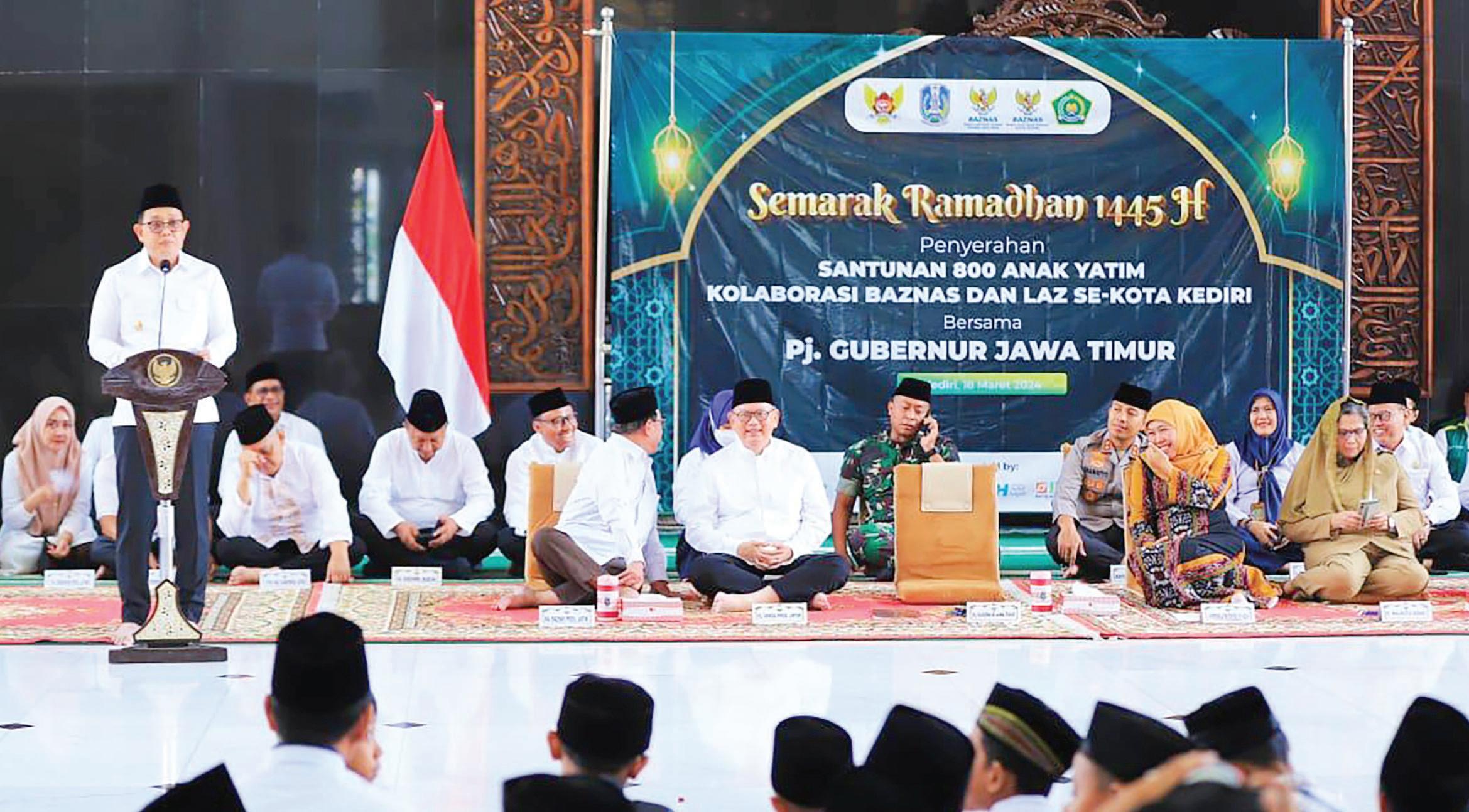 berikan. “Dengan berzakat, kita memperkuat pondasi keimanan, menolong kaum Dhuafa, menyucikan jiwa dari sifat kikir serta meningkatkan ketenangan batin,” tuturnya. Kepada penerima Tali asih dari Pilar sosial dan Seniman, Pj. Gubernur Adhy juga menyampaikan terima kasih atas peran pentingnya di masing-masing bidang. “Kalau ada bencana, Tagana selalu siap di depan. Kepada seniman juga harapannya bisa terus menjaga dan melestarikan budaya di Jawa Timur,” katanya. Di akhir, Adhy juga menyampaikan terima kasih kepada Baznas Jatim dan LAZ Kota Kediri atas dukungan penuh terhadap program Pemprov Jatim. Dukungan dan partisipasi dari semua pihak, termasuk penghimpunan dan penyaluran dana zakat, infak dan sedekah melalui Baznas. “Semoga semua kolaborasi dan ikhtiar kita untuk melakukan peningkatan keimanan bisa mendapatkan barokah dari Allah SWT. Serta bisa menjadi motivasi kita untuk berzakat, demi percepatan penyelesaian permasalahan sosial yang tidak bisa ditangani oleh pemerintah,” terangnya. Yang tidak kalah penting dalam rangkaian Safari Ramadan ini, sambung Adhy, ada gelaran Pasar Murah yang menyediakan berbagai kebutuhan pokok bagi masyarakat. Pasar Murah ini bertujuan untuk menjaga sta-