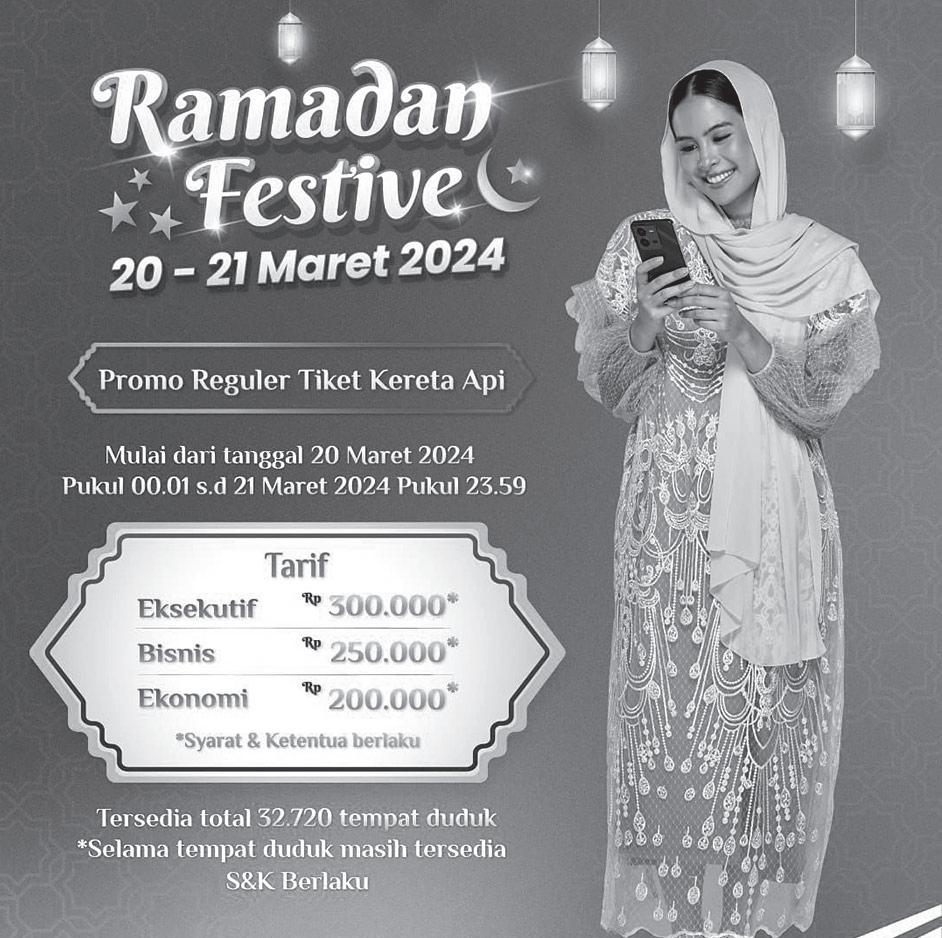 Program Ramadan Festive 2024 yang digelar oleh PT Kereta Api Indonesia (Persero) akan mempermudah masyarakat membeli tiket kereta api dengan dengan potongan harga khusus. Promo ini digelar pada Rabu (20/3) sampai dengan Kamis (21/3) untuk keberangkatan pada periode mudik dan balik Lebaran yakni 27 Maret sampai dengan 11 April 2024 dan 13 sampai dengan 26 April 2024.