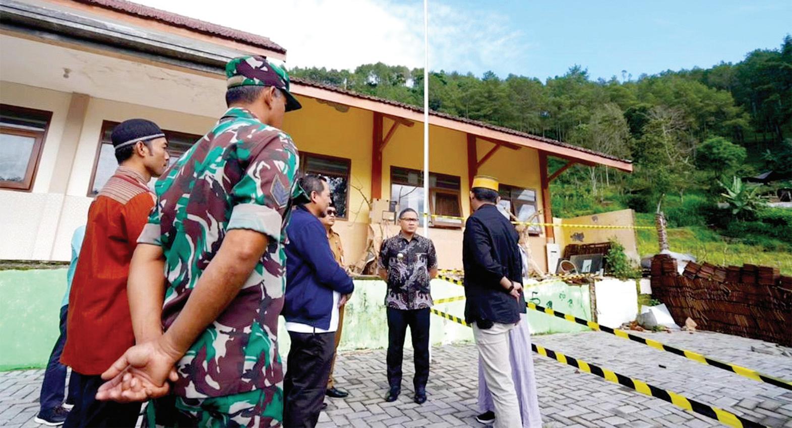 Pj Wali Kota Batu, Aries Agung Paewai dan rombongan saat meninjau SD/SMP Satu Atap yang terdampak bencana tanah bergerak di Dusun Brau, Desa Gunungsari Kota Batu.